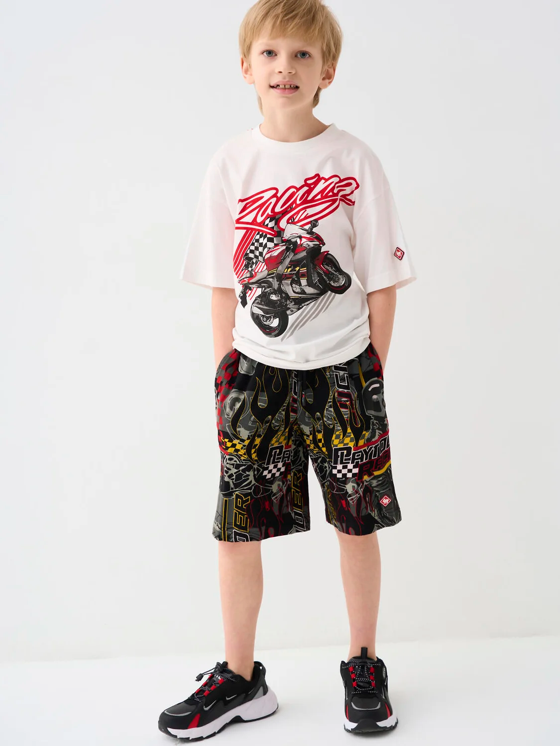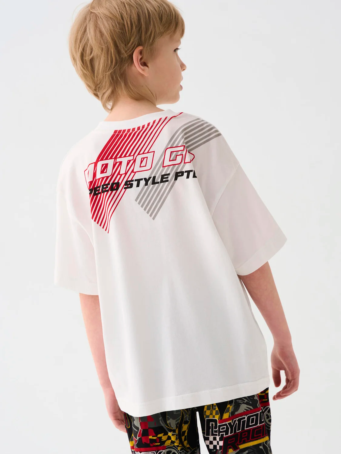 Футболка оверсайз с коротким рукавом для мальчика подростка. Трикотаж с высоким содержанием хлопка. На груди — яркий принт в гоночной тематике с мотоциклом.