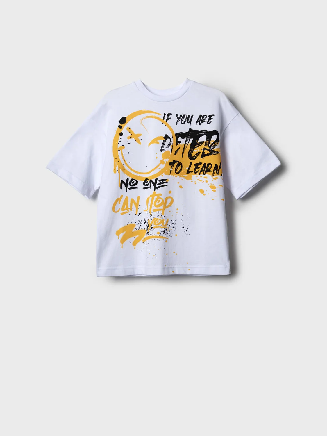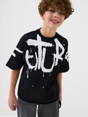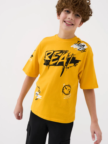 Футболка оверсайз для мальчика подростка. Модель выполнена из эластичного хлопкового трикотажа джерси. Спереди и по спинке модель украшена принтами в стиле граффити. Горловина круглая, обработана эластичным рибом.