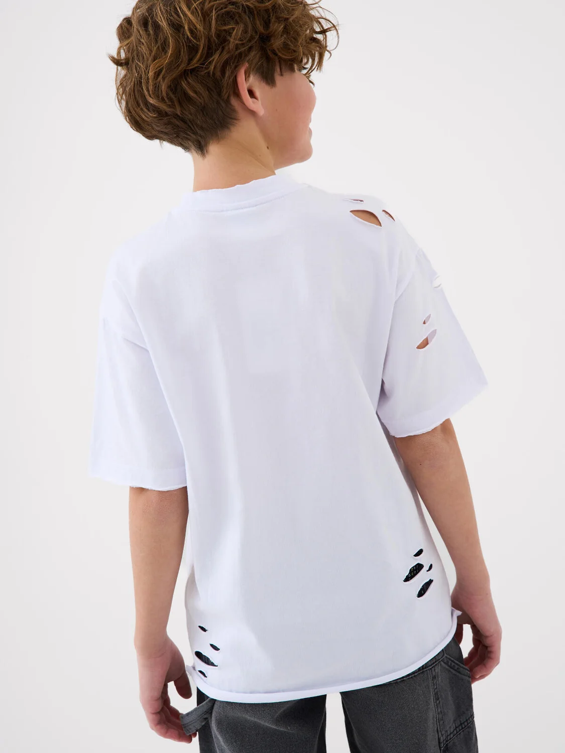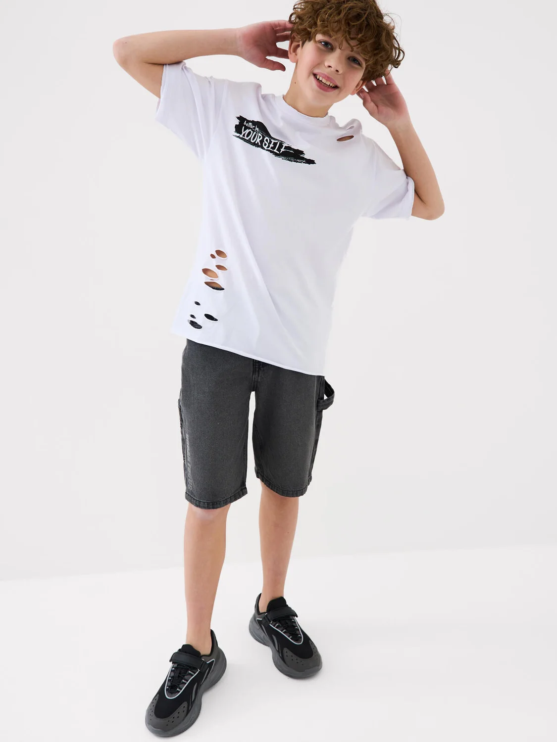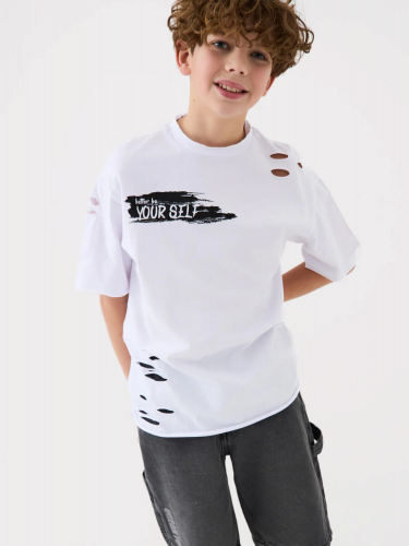 Футболка оверсайз для мальчика подростка. Модель выполнена из эластичного хлопкового трикотажа джерси. На груди расположен принт. Горловина круглая, обработана эластичным рибом. Декоративные разрезы.
