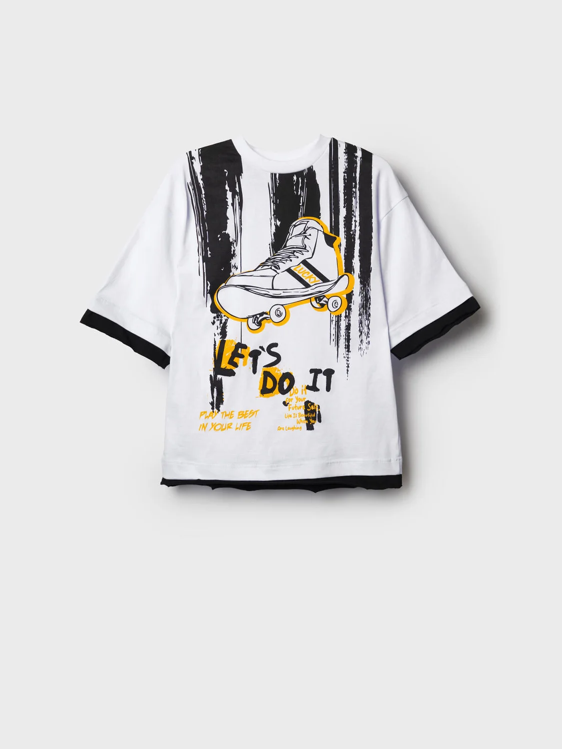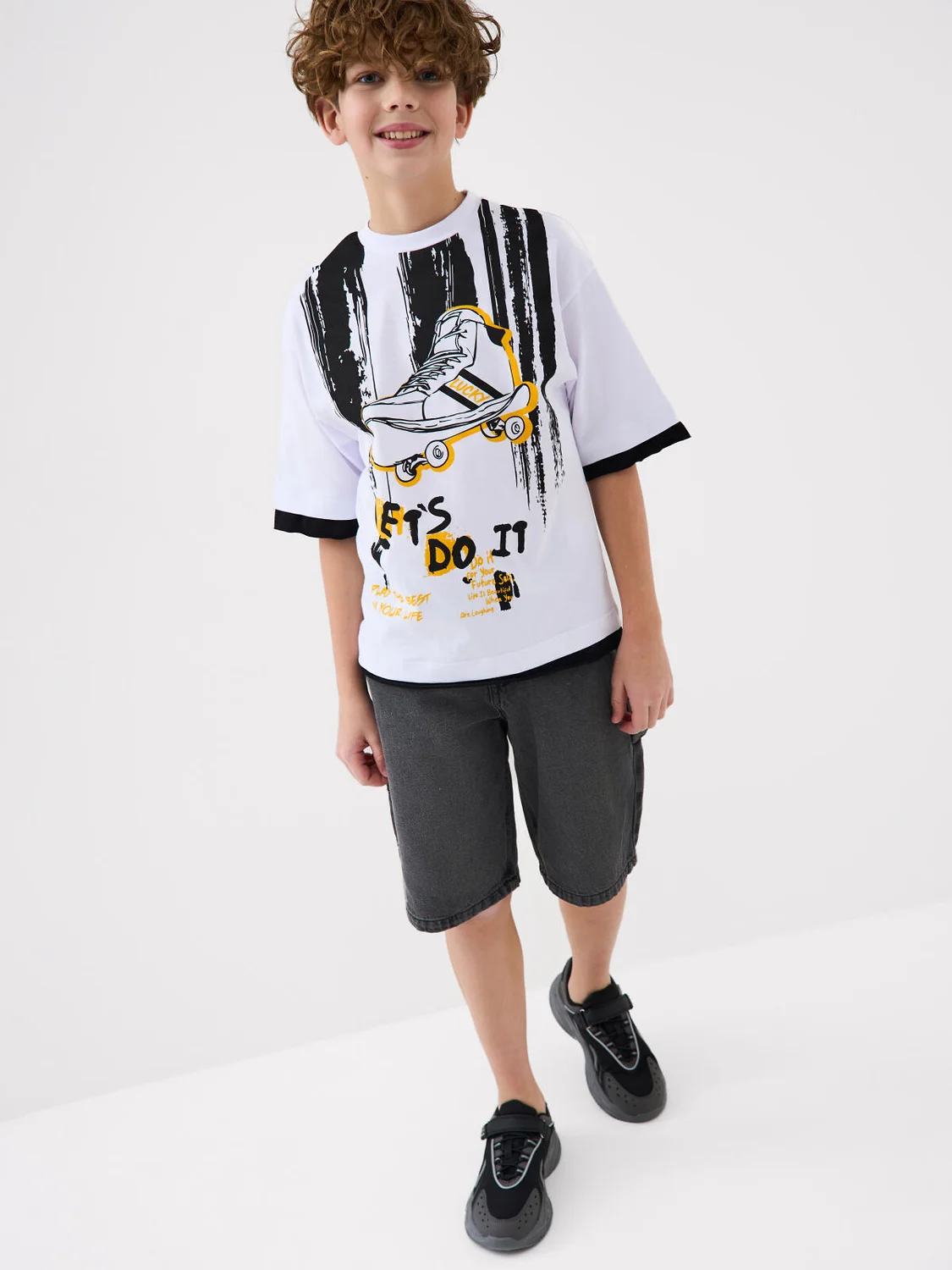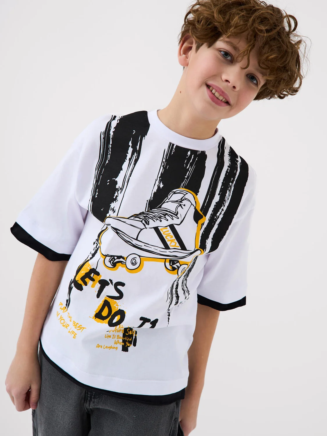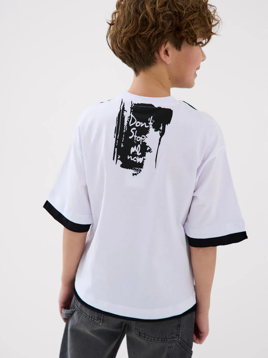 Футболка оверсайз для мальчика подростка. Модель выполнена из эластичного хлопкового трикотажа джерси. Спереди и по спинке расположен крупный принт. Горловина круглая, обработана эластичным рибом.