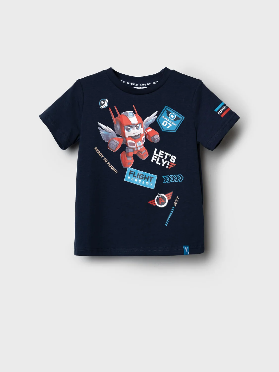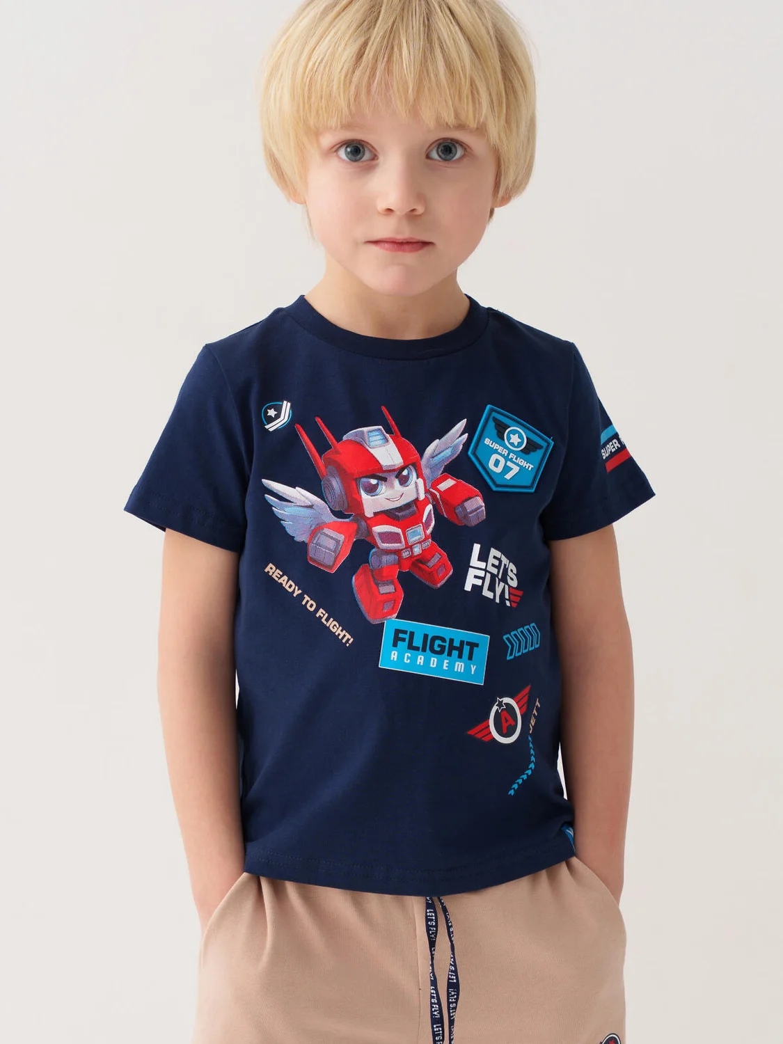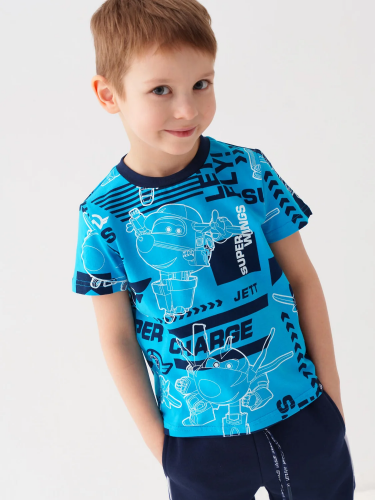 Детская футболка для мальчика. Модель прямого кроя, выполнена из эластичного хлопкового трикотажа джерси. Спереди расположен крупный принт. Горловина круглая, обработана эластичным рибом. В нижней части — небольшая нашивка.