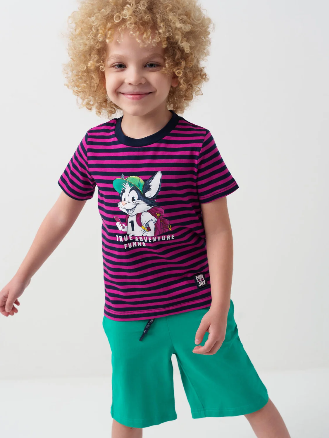Детская футболка для мальчика. Модель прямого кроя, выполнена из эластичного хлопкового трикотажа джерси. Спереди расположен принт. Горловина круглая, обработана эластичным рибом. В нижней части — небольшая силиконовая нашивка.