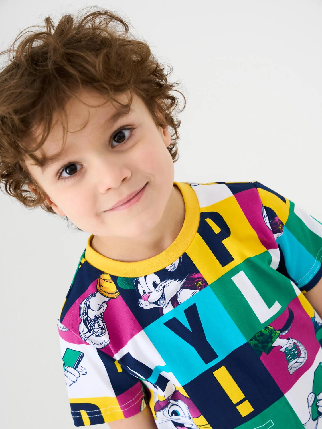 Детская футболка для мальчика. Модель прямого кроя, выполнена из эластичного хлопкового трикотажа джерси. Горловина круглая, обработана эластичным рибом.