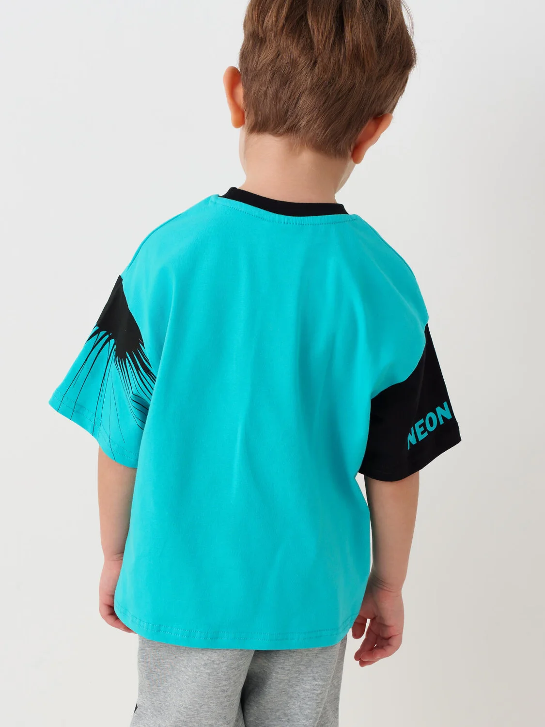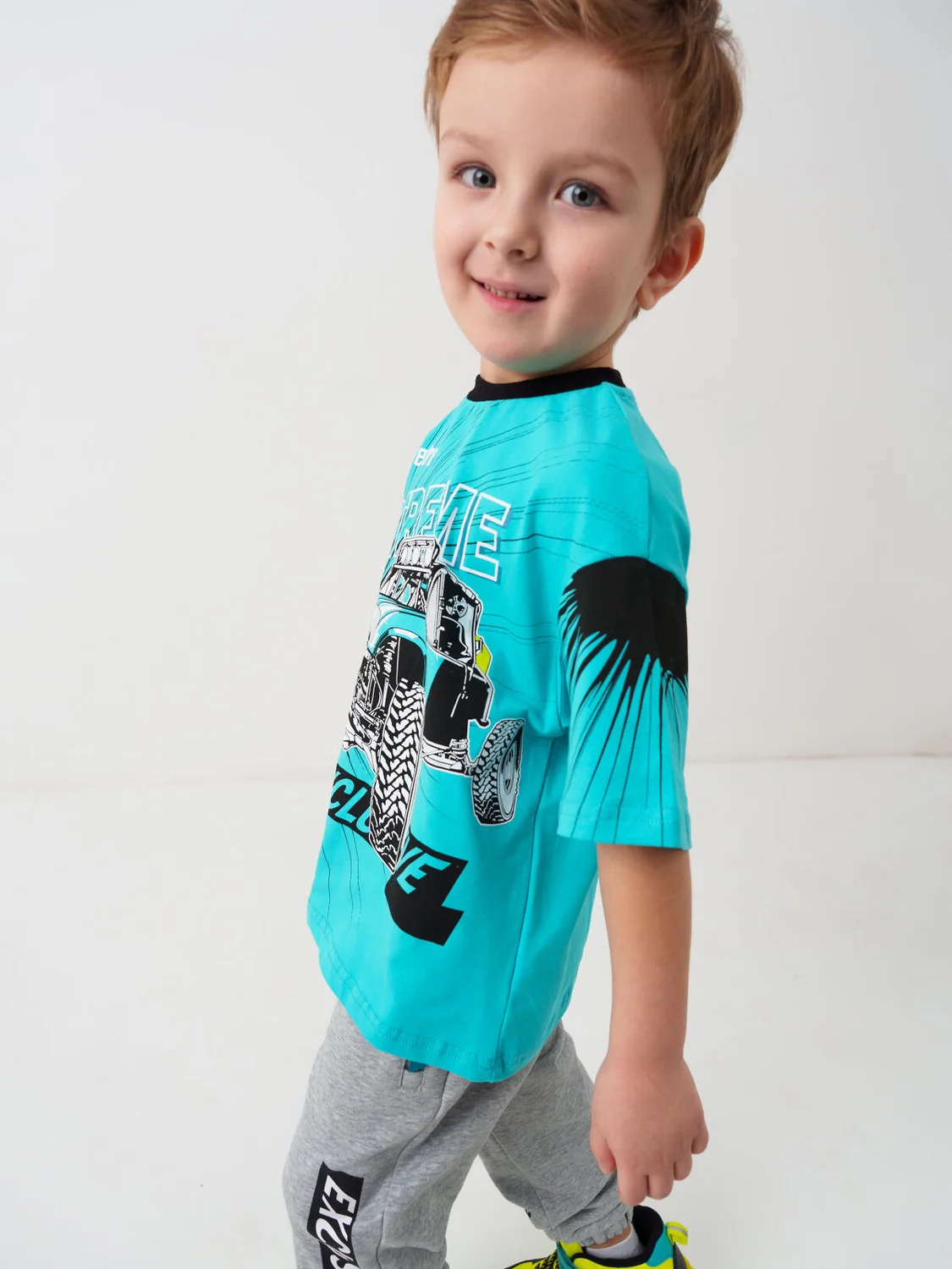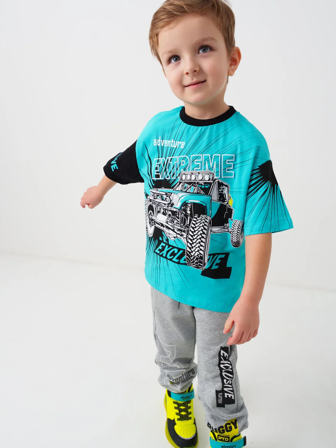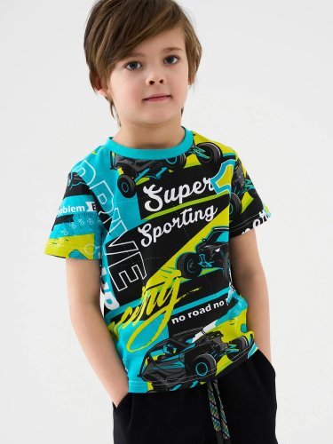 Детская футболка оверсайз для мальчика. Модель выполнена из эластичного хлопкового трикотажа джерси. Спереди расположен крупный принт в гоночной тематике. Горловина круглая, обработана эластичным рибом.