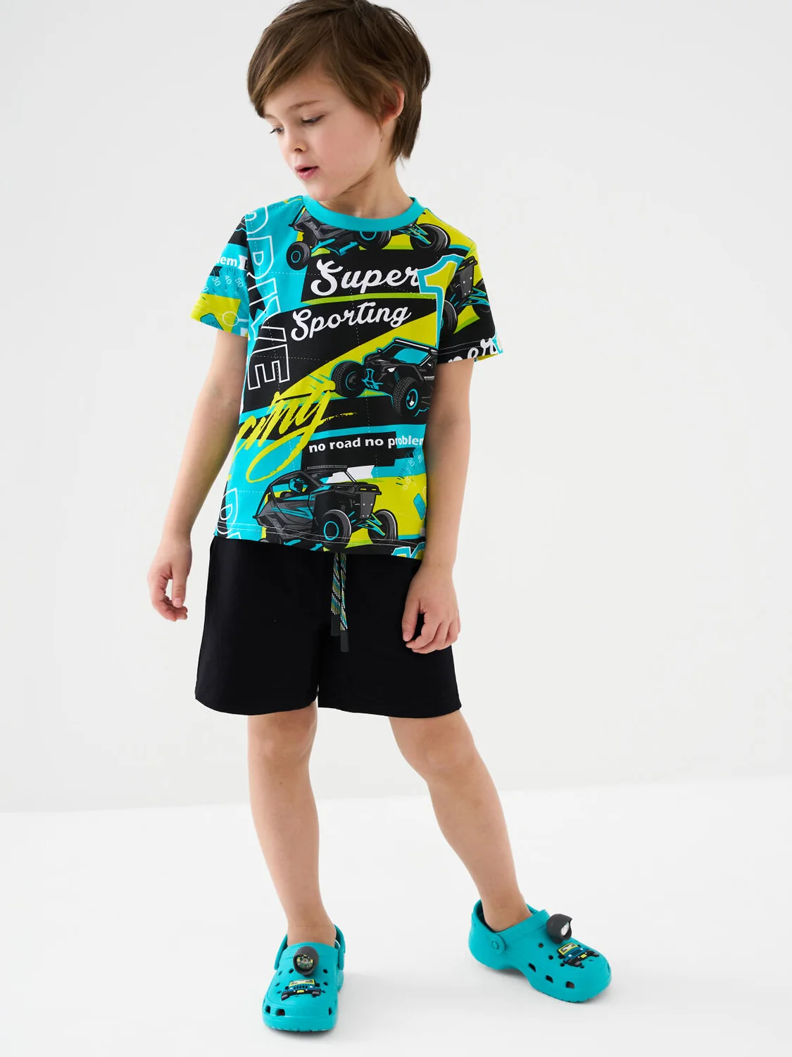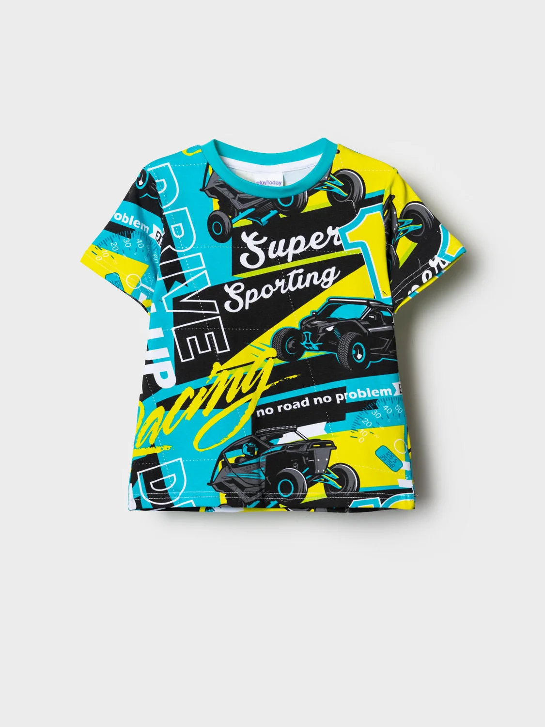 Детская футболка для мальчика. Модель прямого кроя, выполнена из эластичного хлопкового трикотажа джерси. Горловина круглая, обработана эластичным рибом.