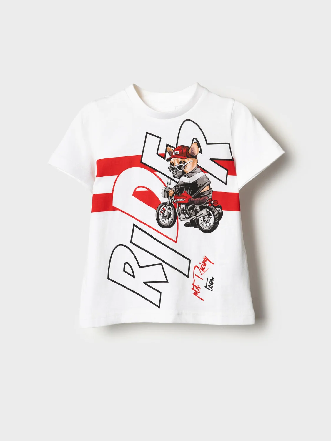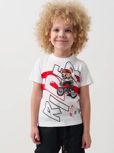 Детская футболка для мальчика. Модель прямого кроя, выполнена из эластичного хлопкового трикотажа джерси. Крупный принт в гоночной тематике. Горловина круглая, обработана эластичным рибом.