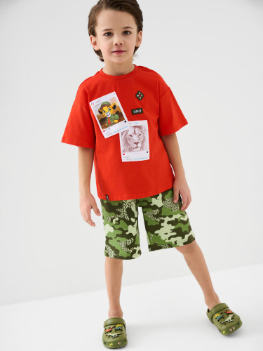 Детская футболка для мальчика. Модель прямого кроя, выполнена из эластичного хлопкового трикотажа джерси. Спереди расположен крупный принт. Горловина круглая, обработана эластичным рибом. На плече — небольшая нашивка.