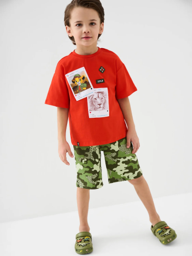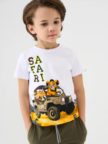 Детская футболка для мальчика. Модель прямого кроя, выполнена из эластичного хлопкового трикотажа джерси. Спереди расположен крупный принт. Горловина круглая, обработана эластичным рибом. На плече — небольшая нашивка.