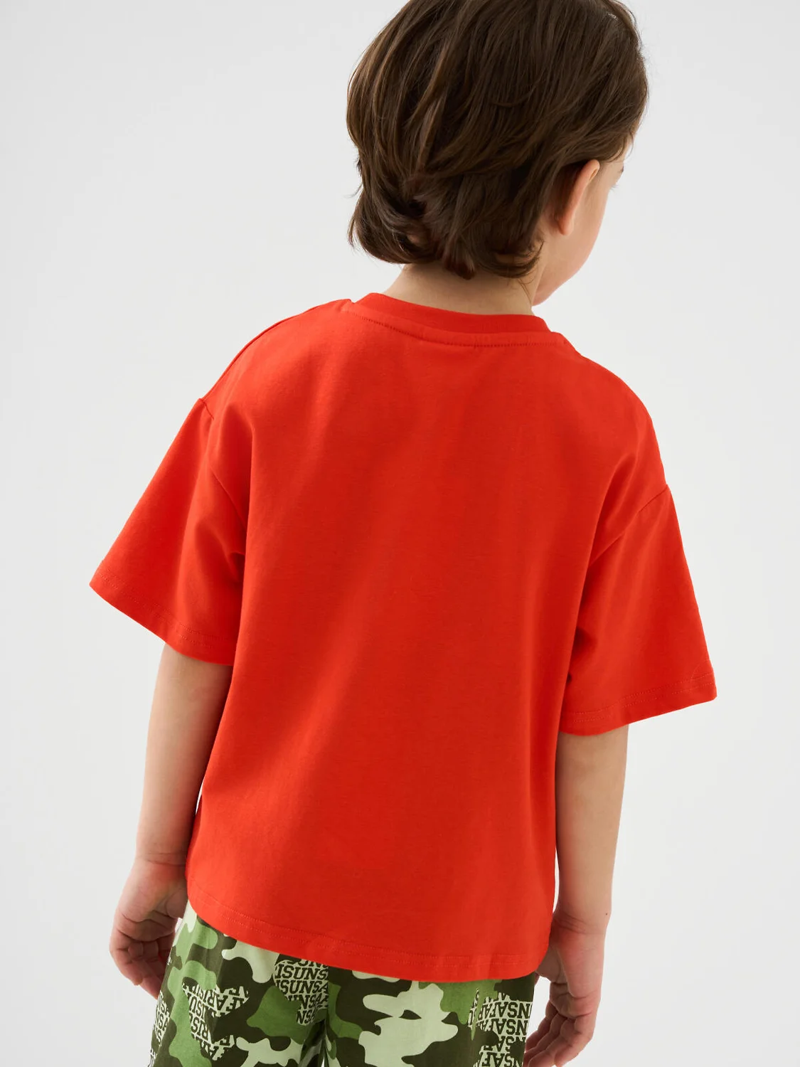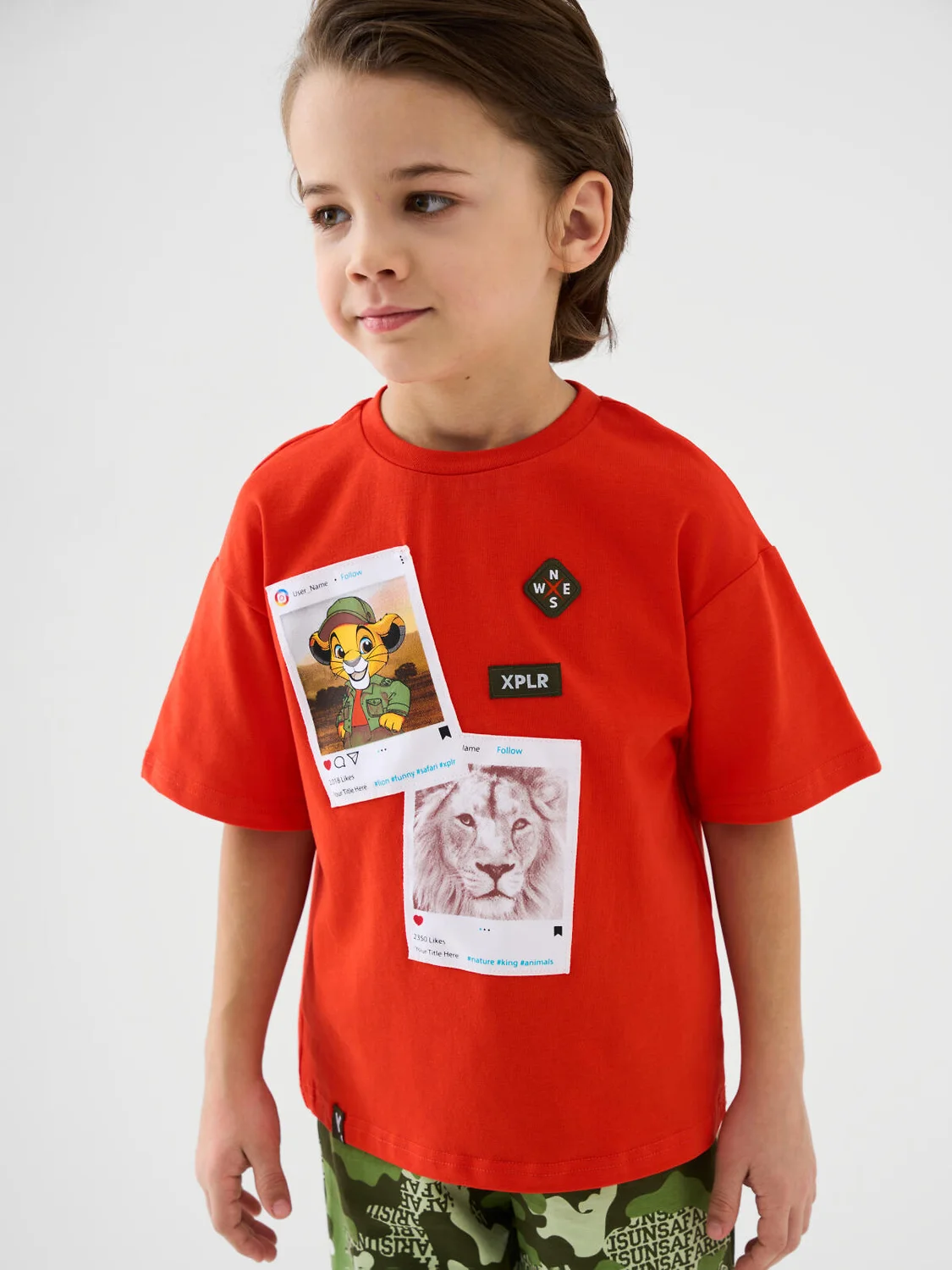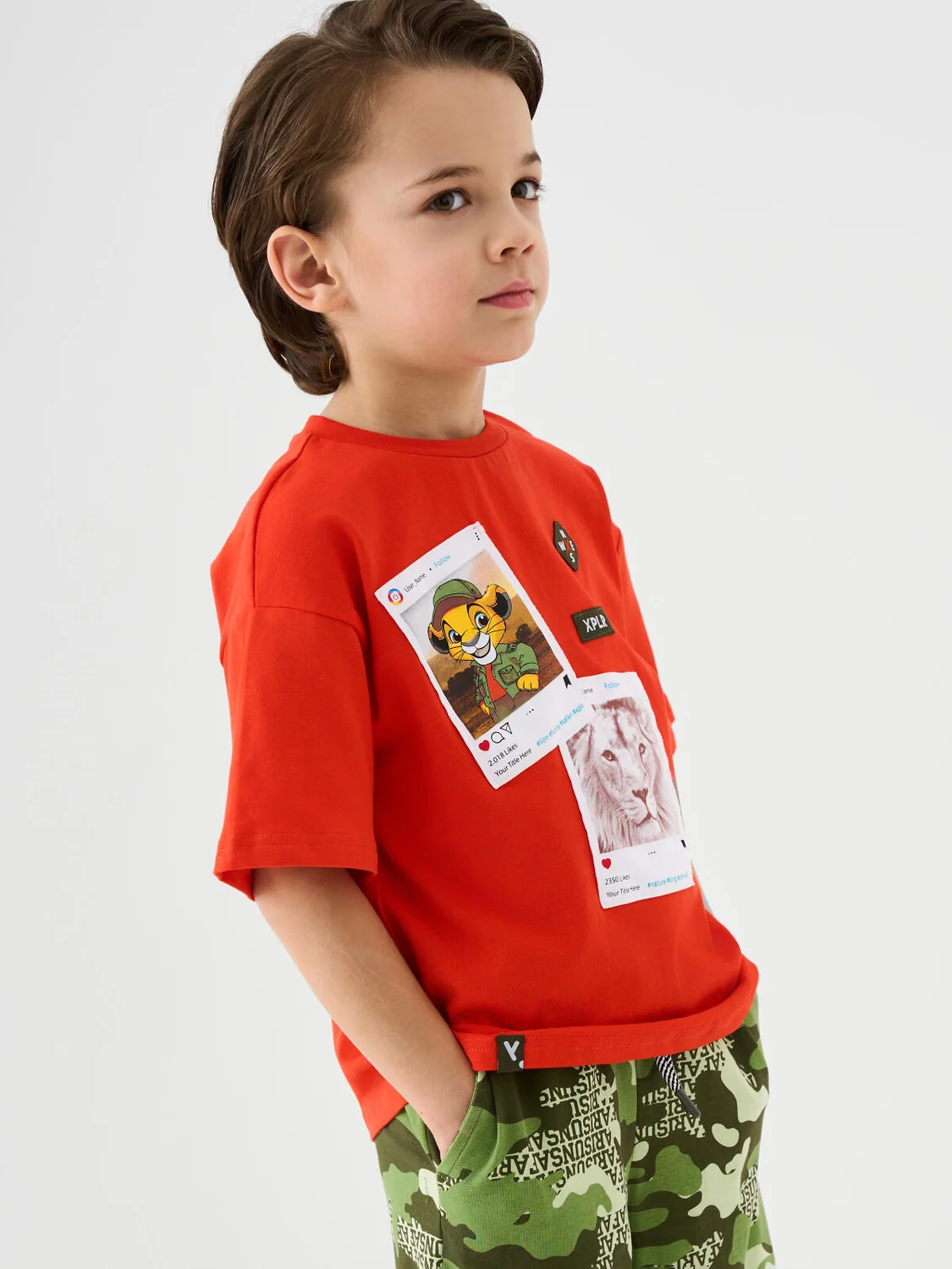 Детская футболка оверсайз для мальчика. Модель выполнена из эластичного хлопкового трикотажа джерси. Спереди расположен крупный принт. Горловина круглая, обработана эластичным рибом. В нижней части — небольшая нашивка.