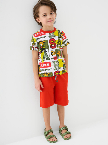 Детская футболка для мальчика. Модель прямого кроя, выполнена из эластичного хлопкового трикотажа джерси. Крупные принты. Горловина круглая, обработана эластичным рибом.