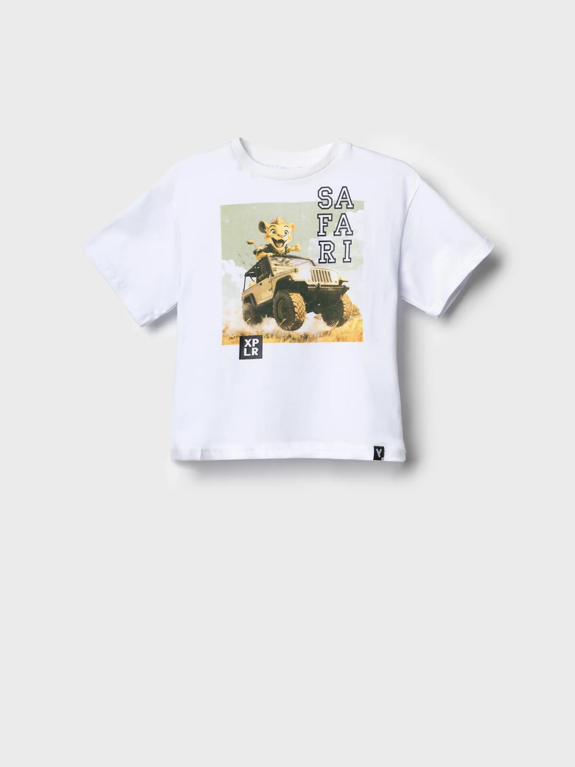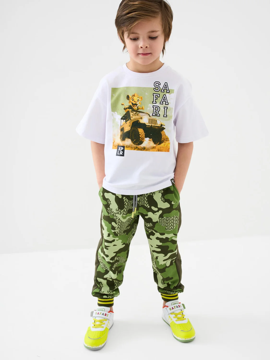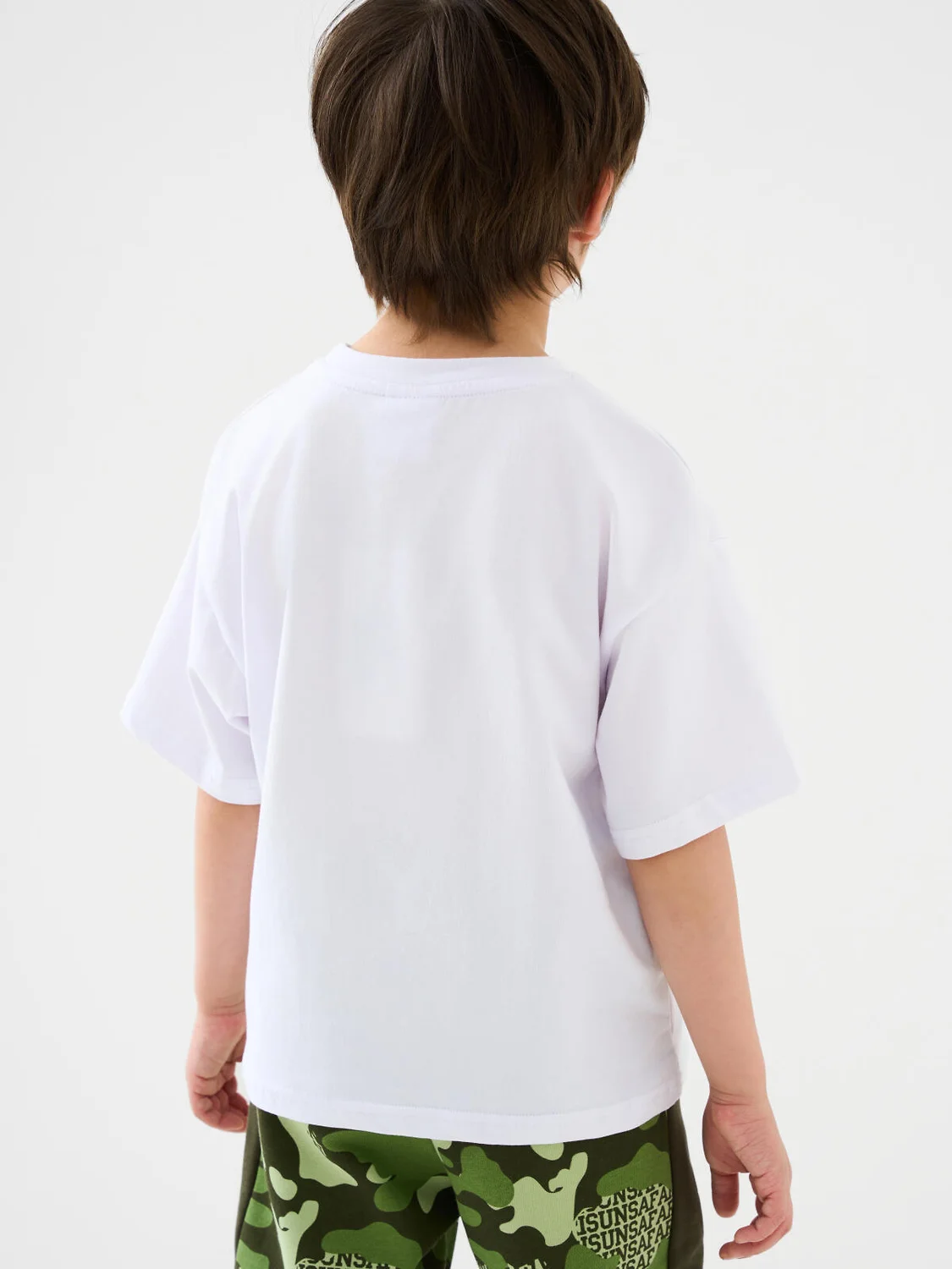 Детская футболка оверсайз для мальчика. Модель, выполнена из эластичного хлопкового трикотажа джерси. Спереди расположен крупный принт. Горловина круглая, обработана эластичным рибом. В нижней части — небольшая нашивка.