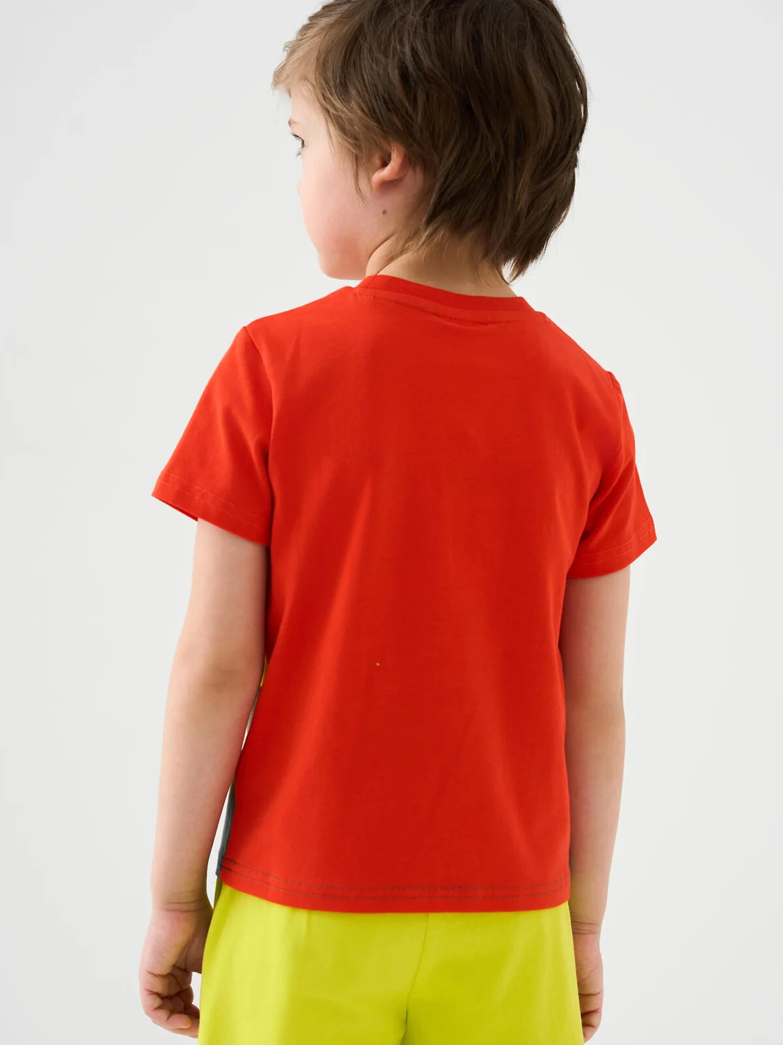 Детская футболка для мальчика. Модель прямого кроя, выполнена из эластичного хлопкового трикотажа джерси. Спереди расположен принт и нагрудный карман. Горловина круглая, обработана эластичным рибом. В нижней части — небольшая нашивка.