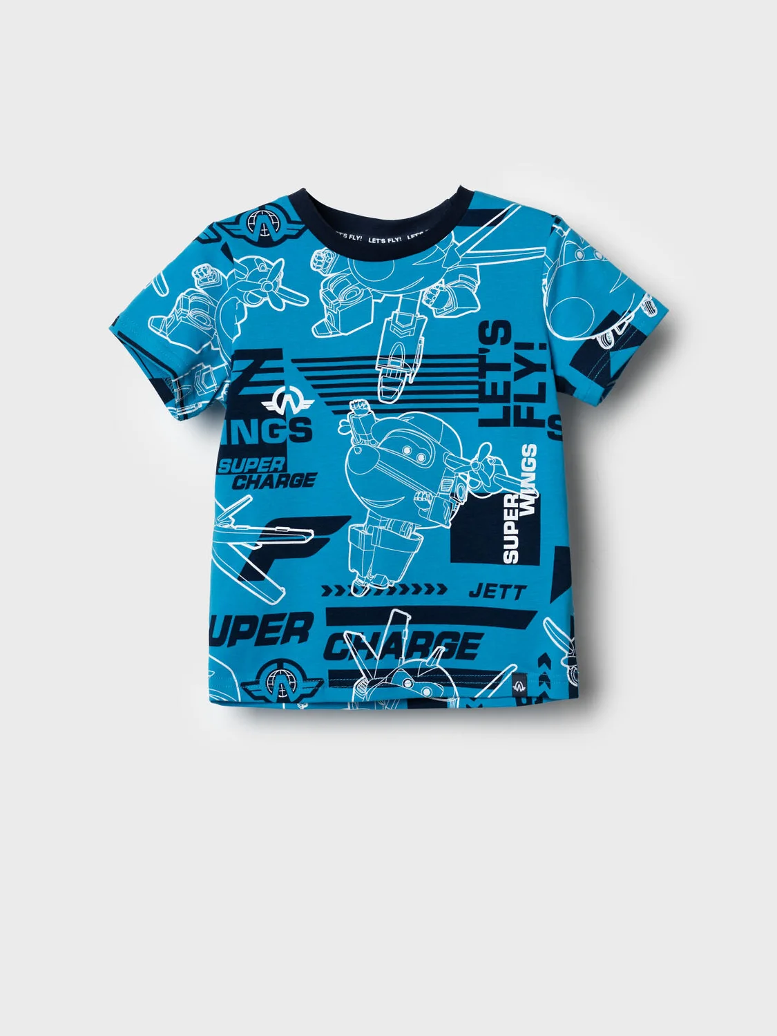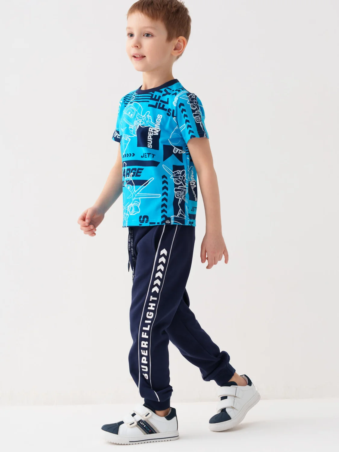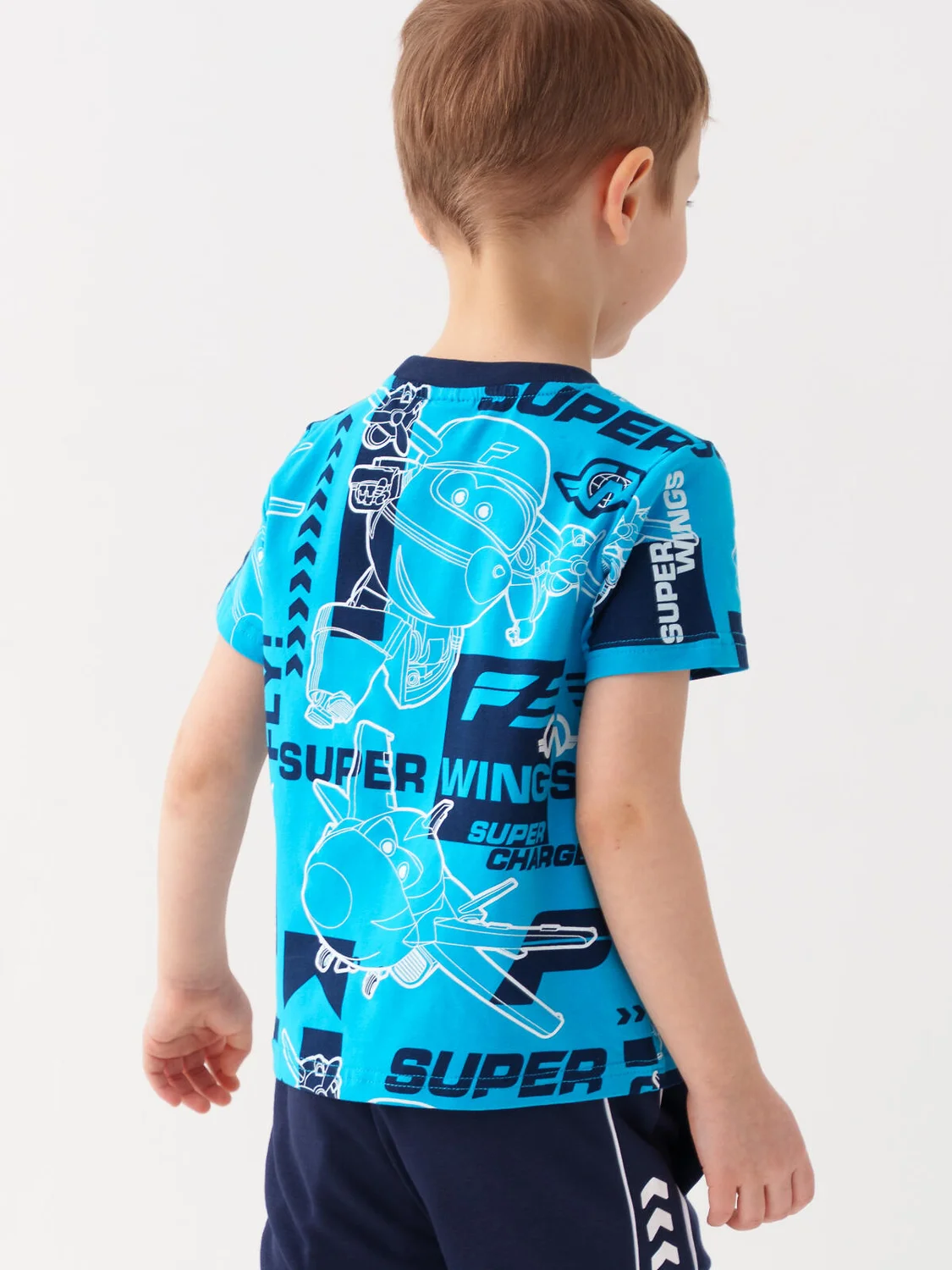 Детская футболка для мальчика. Модель прямого кроя, выполнена из эластичного хлопкового трикотажа джерси. Яркие принты, вдохновленные мультфильмом "Super Wings". Горловина круглая, обработана эластичным рибом. В нижней части — небольшая нашивка.