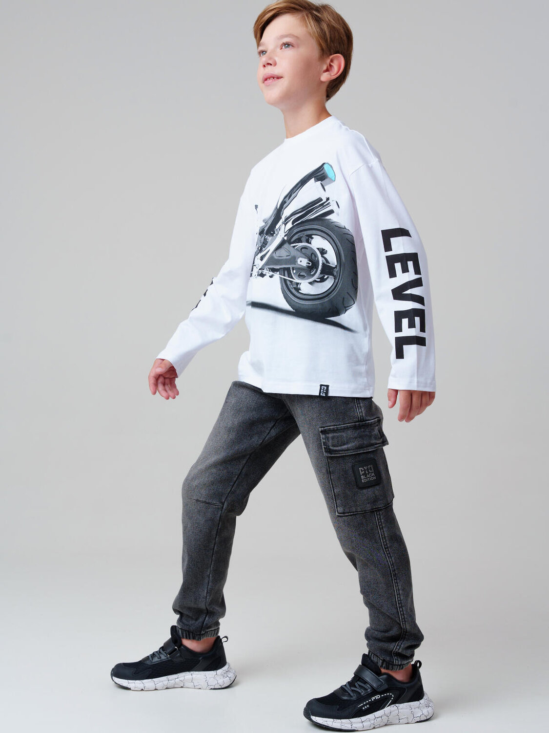 Сочетайте лонгслив с джоггерами и кроссовками PlayToday для спортивного образа, либо с джинсами и жилетом — для школьного комплекта.