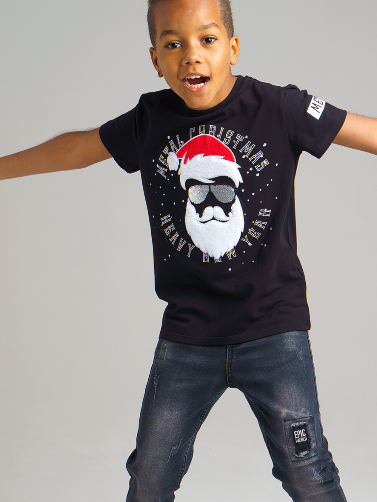 Футболка из качественного и приятного на ощупь трикотажа. Высокое содержание хлопка 95%. Благодаря наличию эластана в составе ткани изделие проще в уходе и держит форму. Новогодняя аппликация с реверсивными двусторонними пайетками и велюром. Горловина в эластичный рубчик. 95% хлопок, 5% эластан