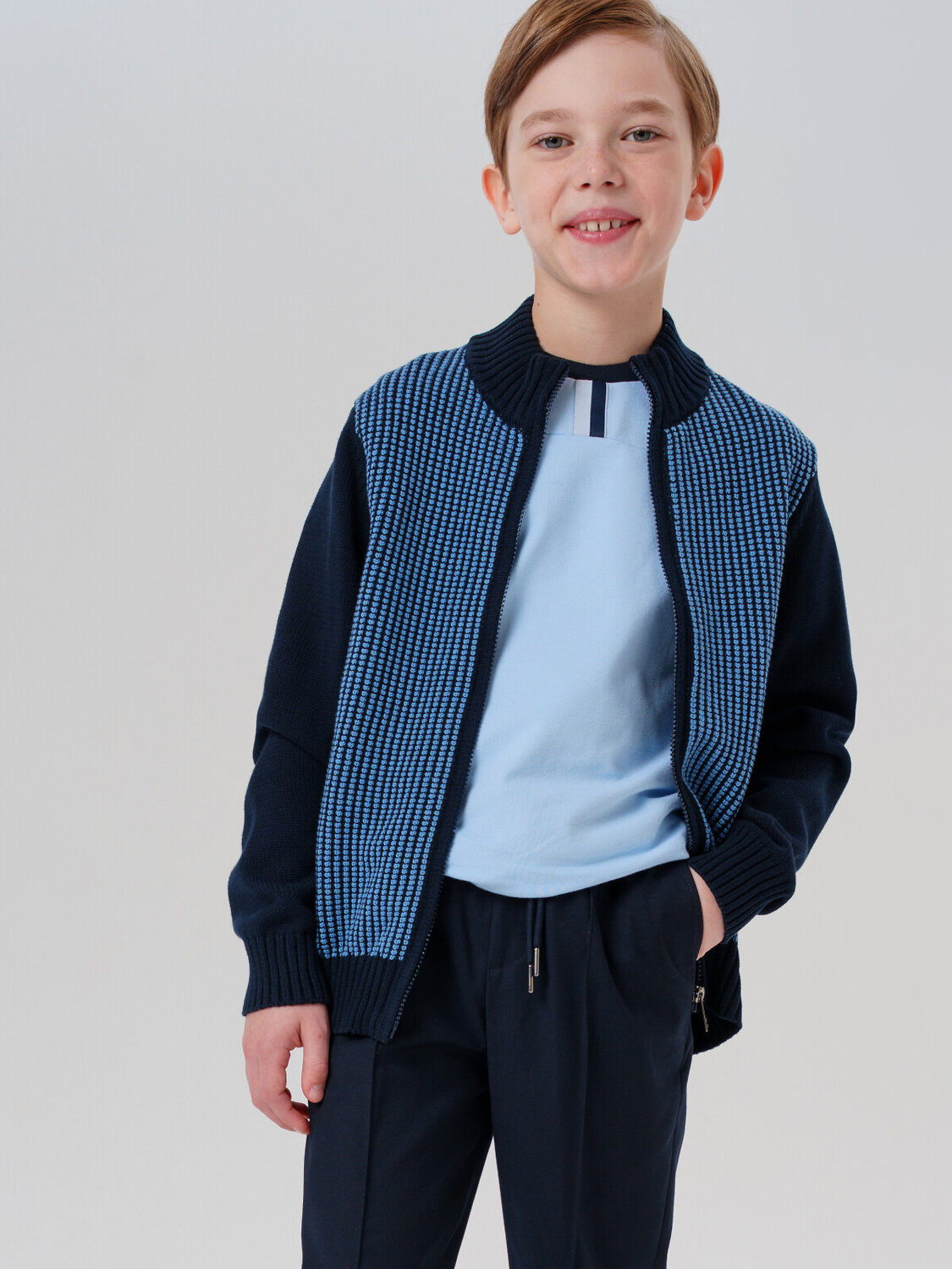 Стильный школьный темно-синий кардиган на молнии для мальчика-подростка.