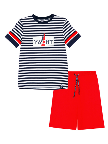 Комплект: футболка, шорты из качественного и приятного на ощупь трикотажа джерси. Высокое содержание хлопка 95%. Благодаря наличию эластана в составе ткани изделие проще в уходе и держит форму. Regular fit. Эластичный пояс со шнурком. Функциональные карманы в боковых швах.