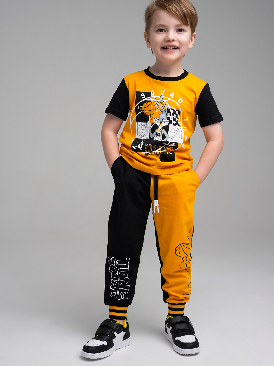 Костюм детский для мальчика. Комплект: футболка, брюки. Высокое содержание хлопка 95%. Благодаря наличию эластана в составе ткани изделие проще в уходе и держит форму. Штаны на резинке со шнурком. Боковые карманы.
