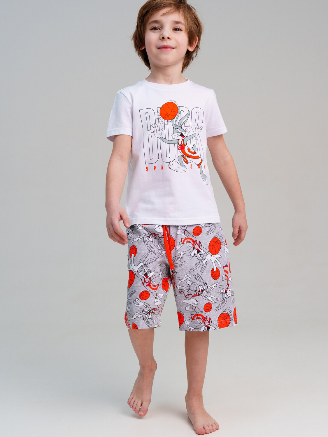Костюм детский для мальчика. Футболка и шорты из эластичного и приятного на ощупь трикотажа. Шорты на резинке со шнурком. Высокое содержание хлопка 95%. Благодаря наличию эластана в составе ткани изделие держит форму и меньше мнется.