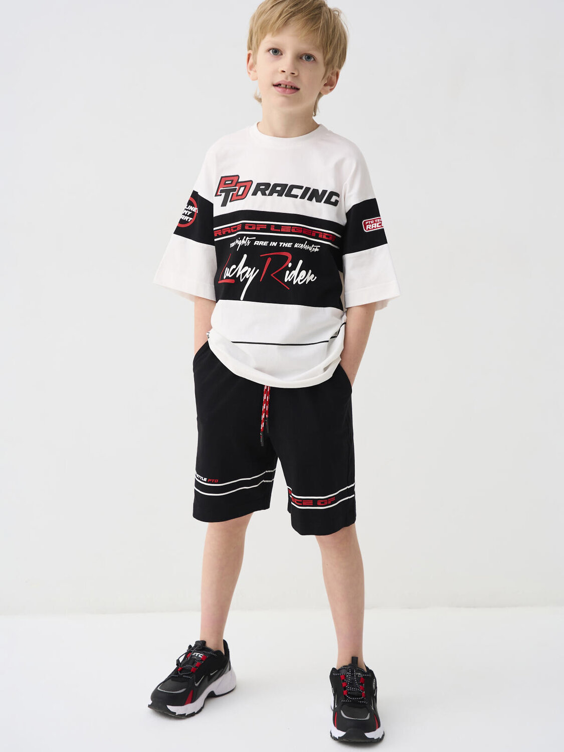Комплект трикотажный из футболки и шорт для мальчика подростка. Костюм подходит для повседневной носки в летний сезон. Выполнен из мягкого и эластичного трикотажа с высоким содержанием хлопка. Посадка футболки — oversize, что придаёт образу актуальный расслабленный стиль. Шорты средней длины с комфортной посадкой на резинке со шнурком. Боковые карманы. Дополнительно украшены яркими принтами и декоративной отделкой.