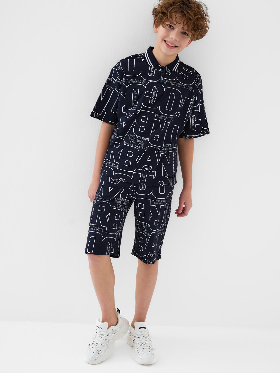 Костюм для мальчика подростка. Состоит из футболки и шорт. Выполнен из хлопкового трикотажа пике. Футболка оверсайз с воротником поло на молнии. Красочный принт. Шорты свободные, с эластичным поясом и шнурком для регулировки посадки. Удобные боковые карманы.