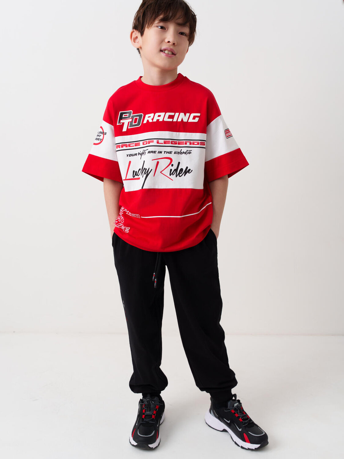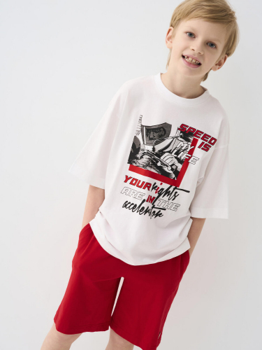 Костюм для мальчика подростка. Состоит из футболки с коротким рукавом и брюк джоггеров. Футболка оверсайз с яркими принтами в гоночной тематике. Брюки выполнены из плотного хлопкового трикотажа. Модель с комфортной посадкой, пояс на резинке дополнен шнурком. Удобные боковые карманы. Внизу — эластичные манжеты.