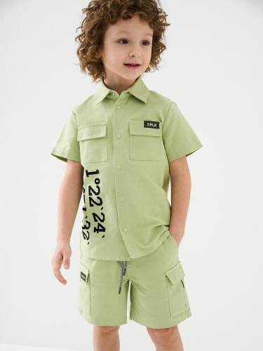 Детский костюм для мальчика. Состоит из футболки и шорт. Выполнен из хлопкового трикотажа. Футболка прямого кроя, с коротким рукавом. Яркий принт и нашивки. Шорты свободные, с эластичным поясом и шнурком для регулировки посадки. По бокам расположены карманы.