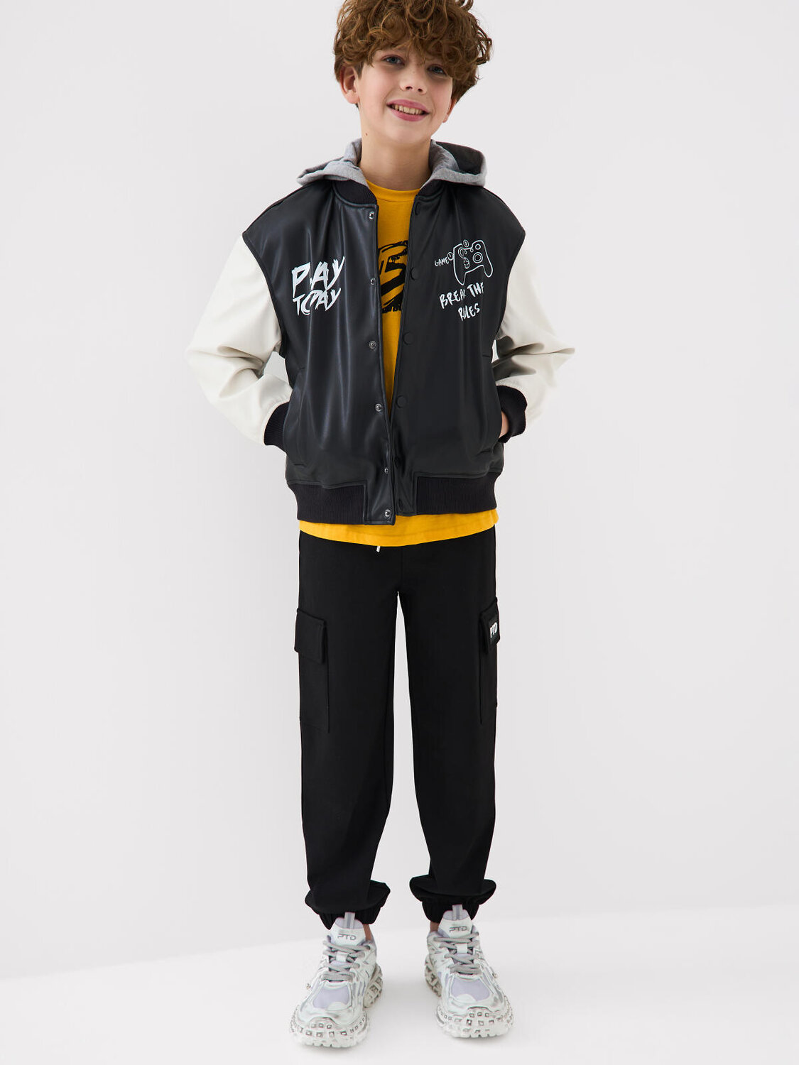 Бомбер для мальчика подростка. Температурный режим от +20°C до +10°C. Внутри гладкая подкладка. Застежка — на кнопки. Два боковых кармана. Низ и манжеты оформлены рибом. Капюшон — несъемный, с серой подкладкой. Внутри — дополнительные карманы. Бомбер подходит для повседневной носки и подчеркивает стильный городской образ.