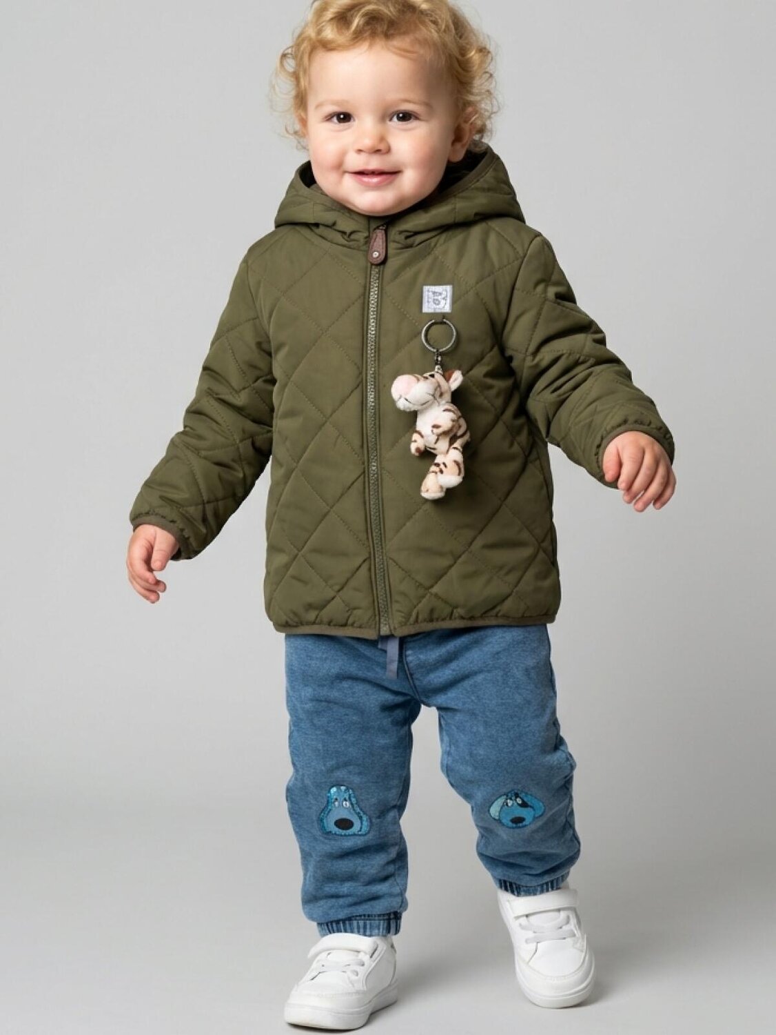 Куртка демисезонная стеганая для мальчика. Температурный режим от +15С до 0С. Ткань с ветрозащитным и водоотталкивающим покрытием. Внутри — гладкая подкладка из таффеты. Капюшон несъемный с эластичной окантовкой. Удобные боковые карманы. Внизу изделия и на манжетах — эластичная окантовка, которая помогает лучше прилегать к телу. Яркий акцент — мягкий съемный брелок в виде тигрёнка и декоративная нашивка спереди.