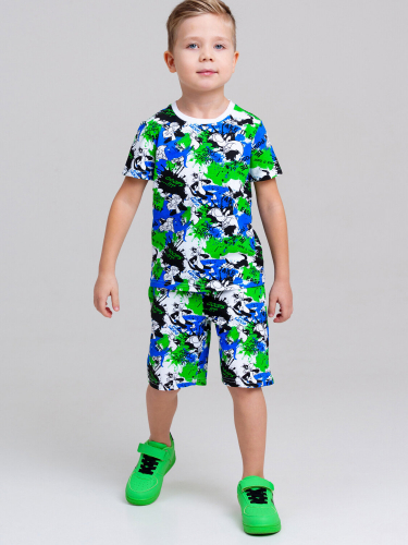 Пижама детская для мальчика. Футболка и шорты из эластичного и приятного на ощупь трикотажа. Шорты на резинке со шнурком. Шорты с карманами в боковых швах. Высокое содержание хлопка 95%. Благодаря наличию эластана в составе ткани изделие держит форму и меньше мнется.