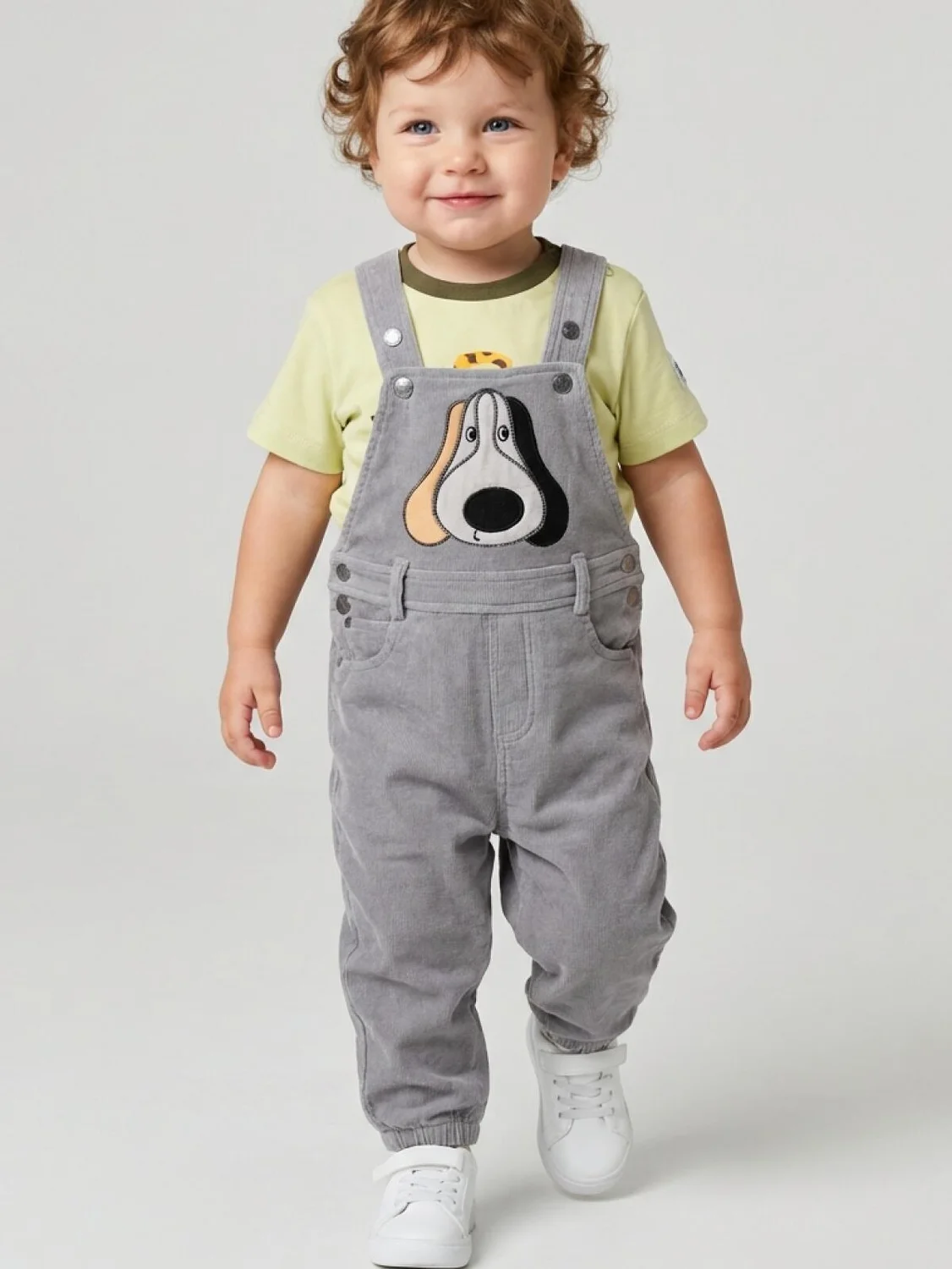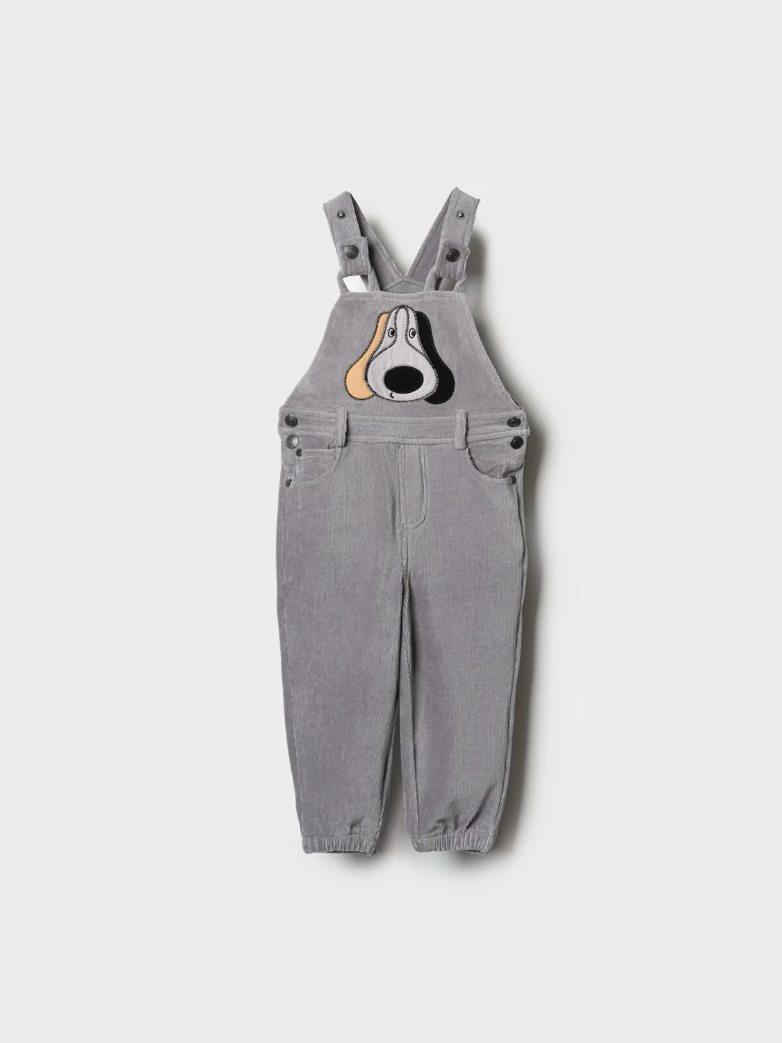 Детский трикотажный полукомбинезон для мальчика. Модель выполнена в сером цвете под джинсу. Спереди на грудке — яркая и милая аппликация в виде собаки. Спинка украшена двумя задними карманами. Штанины с мягкой сборкой на резинке. Лямки перекрещиваются на спине и застёгиваются на кнопки спереди. Изделие имеет удобные боковые застёжки на кнопках и резинку на поясе сзади для комфортной посадки.