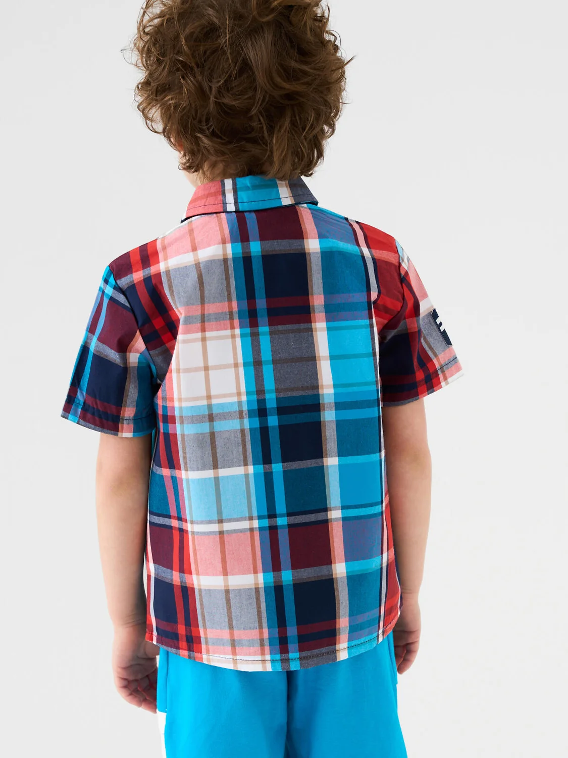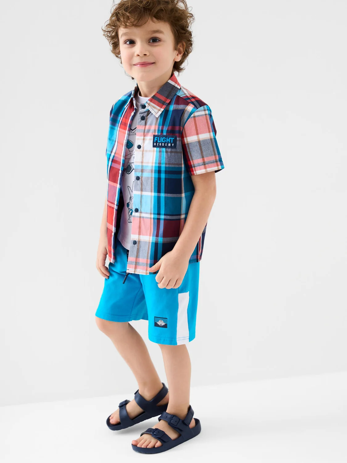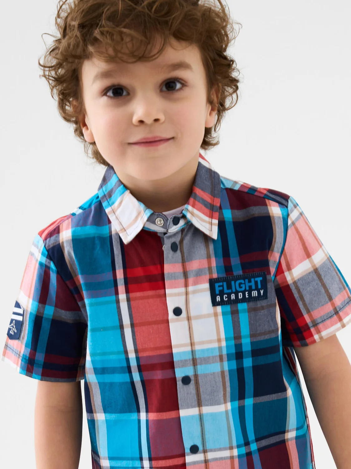 Детская рубашка в клетку для мальчика. Модель прямого кроя, с коротким рукавом. Выполнена из хлопковой ткани поплин. У изделия классический отложной воротник и удобная застежка на кнопки. На груди расположен яркий принт, а на правом рукаве — декоративная нашивка с изображением самолета.