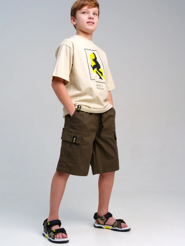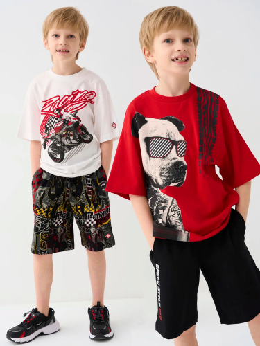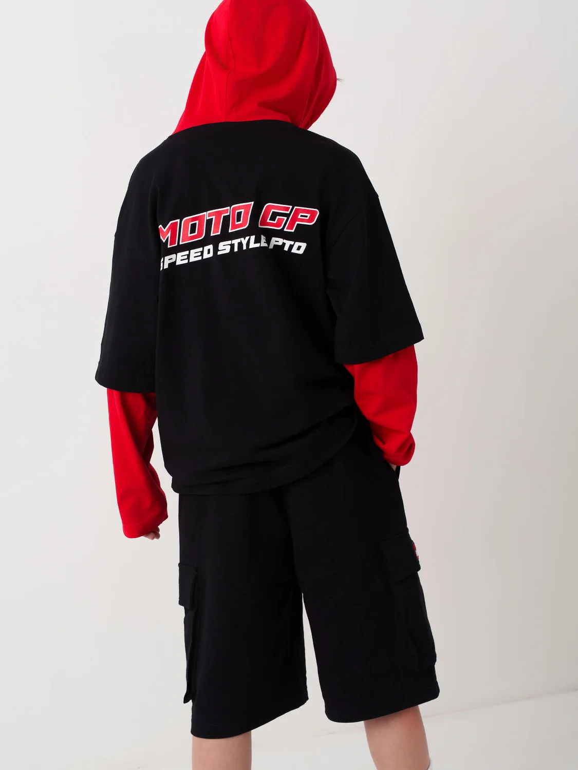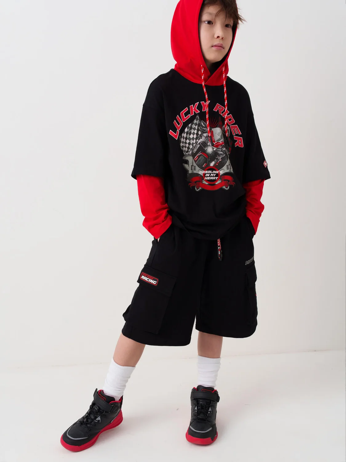 Чёрные трикотажные шорты для мальчика подростка с комфортной посадкой и длиной ниже колена. У шорт эластичный пояс с широкой резинкой и шнуром. Спереди расположены боковые карманы, а по бокам – объёмные карманы-карго с клапанами на липучках. На левом кармане нашивка "RACING", на правом – принт "LUCKY RIDER", рядом – надпись "MOTO GP". Шорты подойдут для активного отдыха и повседневной носки летом.