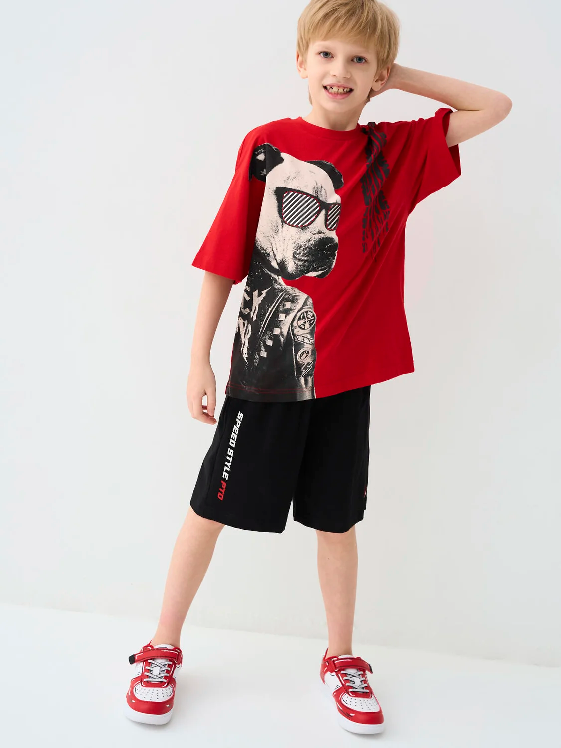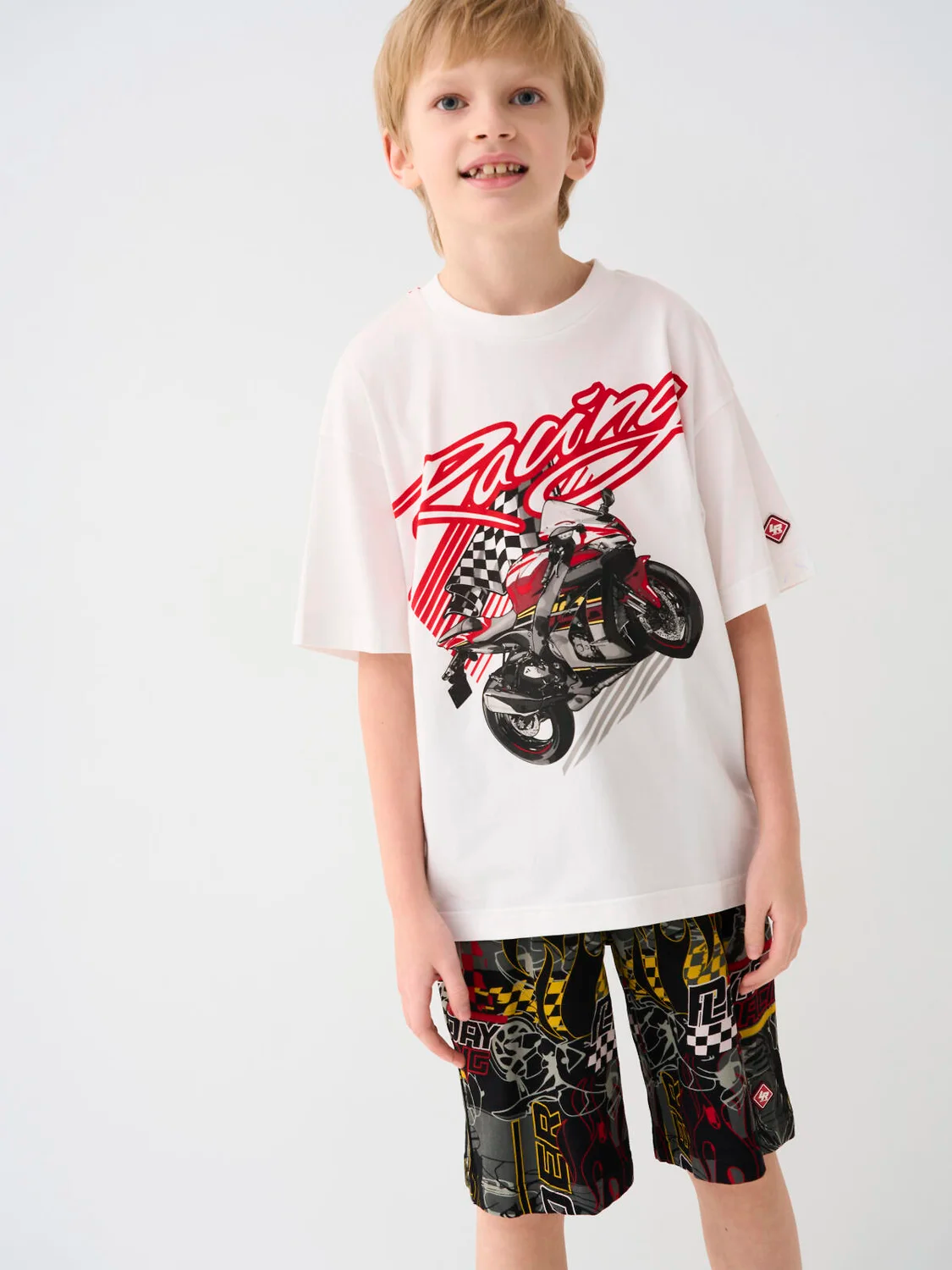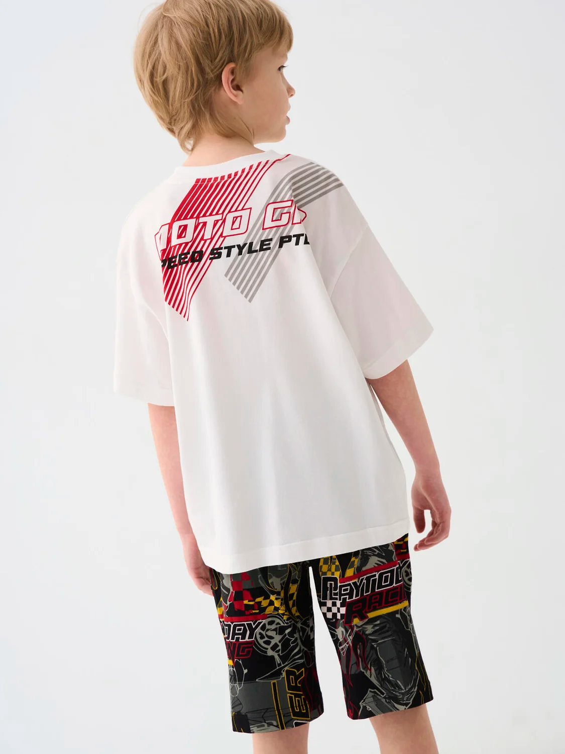 Набор спортивных шорт для мальчика подростка. Шорты выполнены из мягкого трикотажа с эффектным принтом: пламя, шлем гонщика, надписи "PLAYTODAY RACING", "SPEED STYLE PTO", и графика в стиле мотоспорта. Модель средней длины, с удобным эластичным поясом и шнурком. Есть два боковых кармана. Внизу — фирменная нашивка. Отличный выбор для активных подростков, которые любят яркий и смелый стиль.