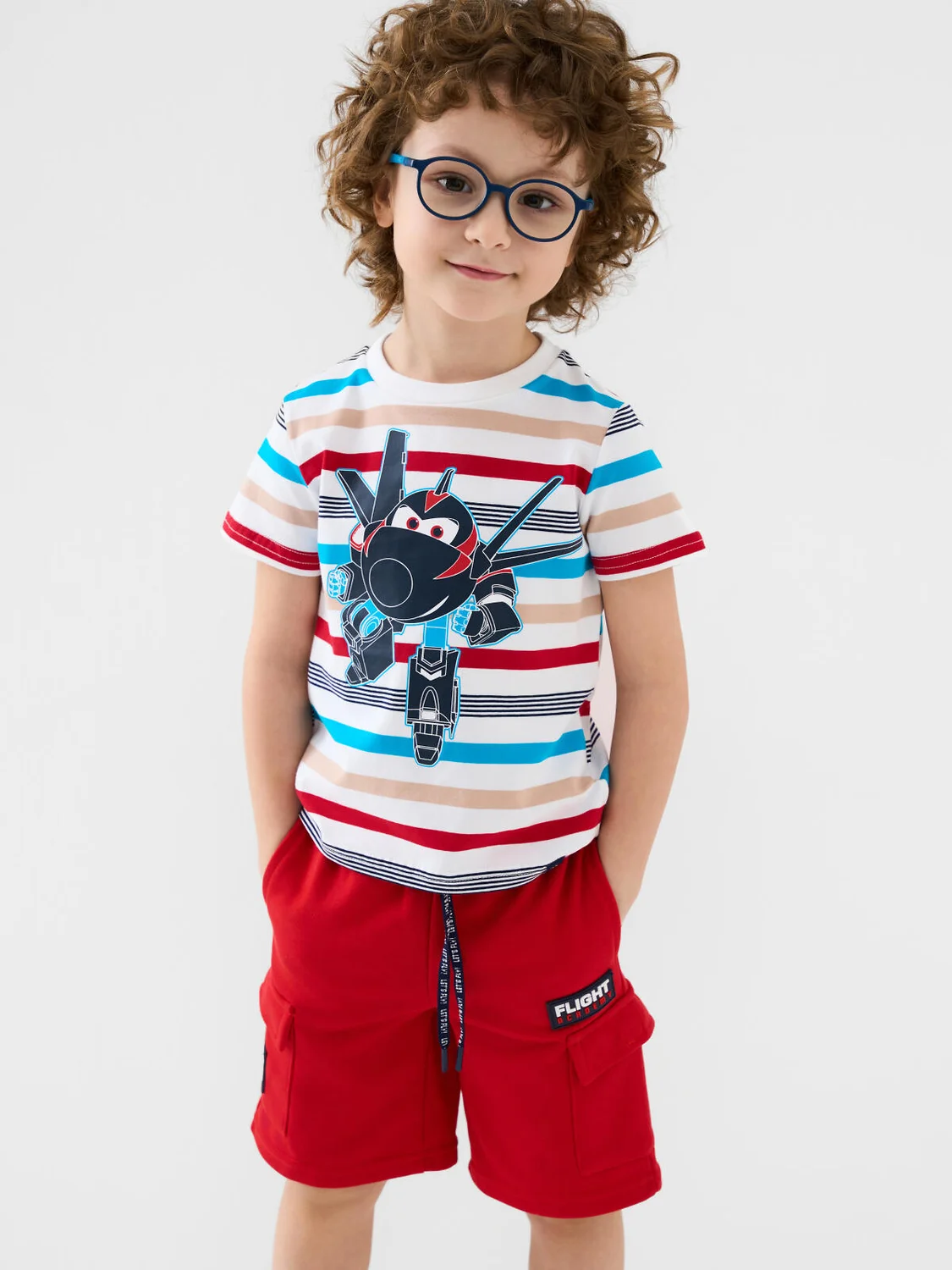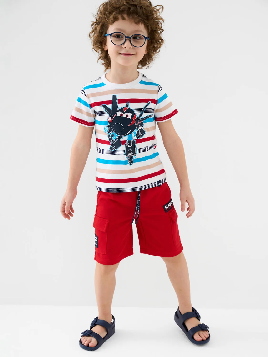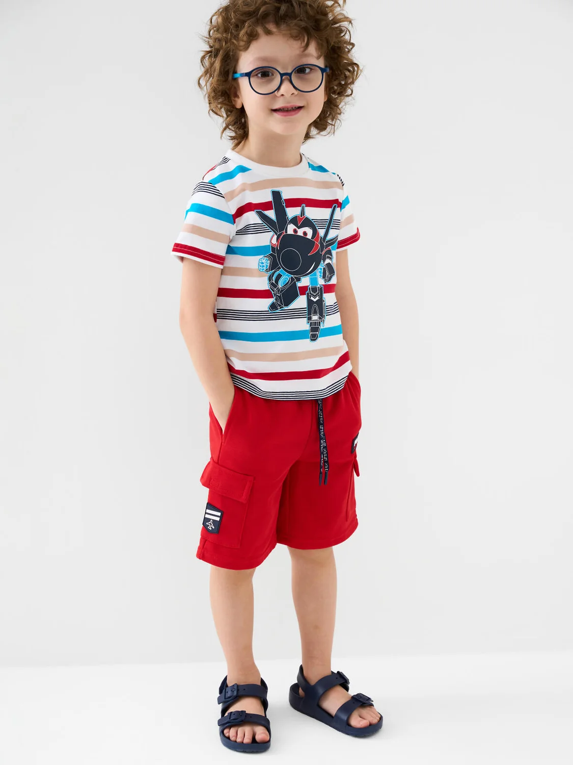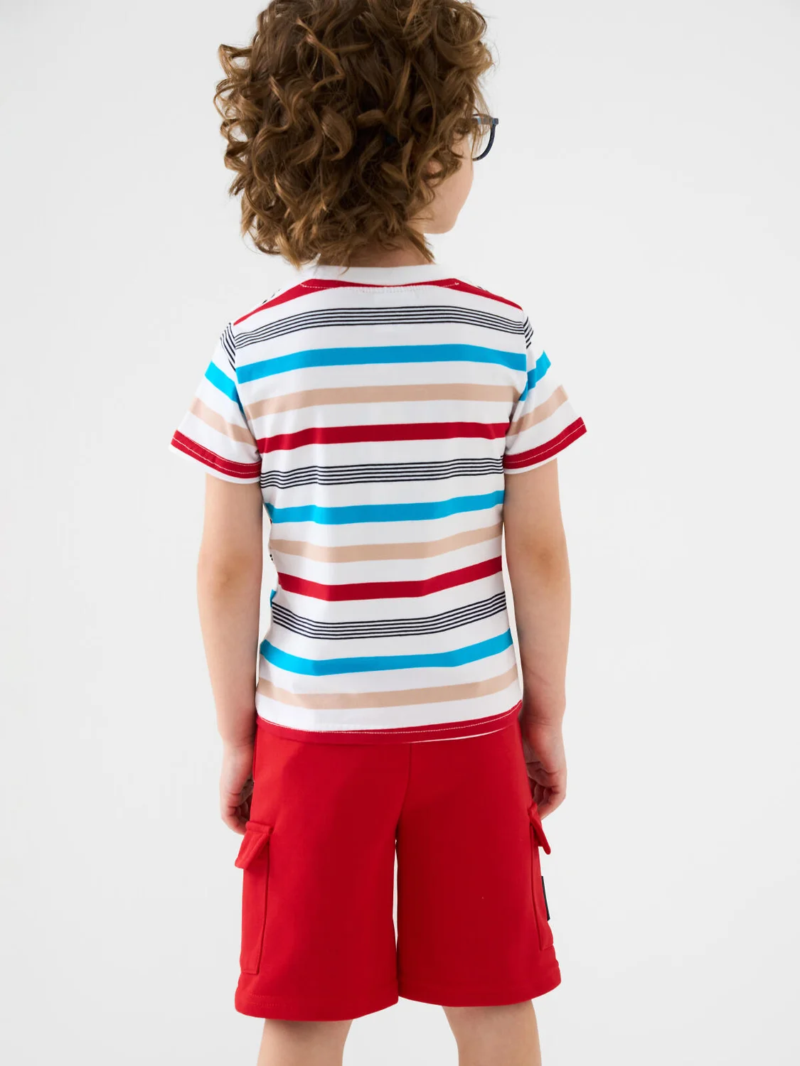 Шорты детские для мальчика. Модель свободного кроя из мягкого, хлопкового трикотажа футер. Удобная посадка обеспечивается эластичным поясом со шнуром. Спереди — декоративные нашивки, боковые карманы и накладные карманы-карго.
