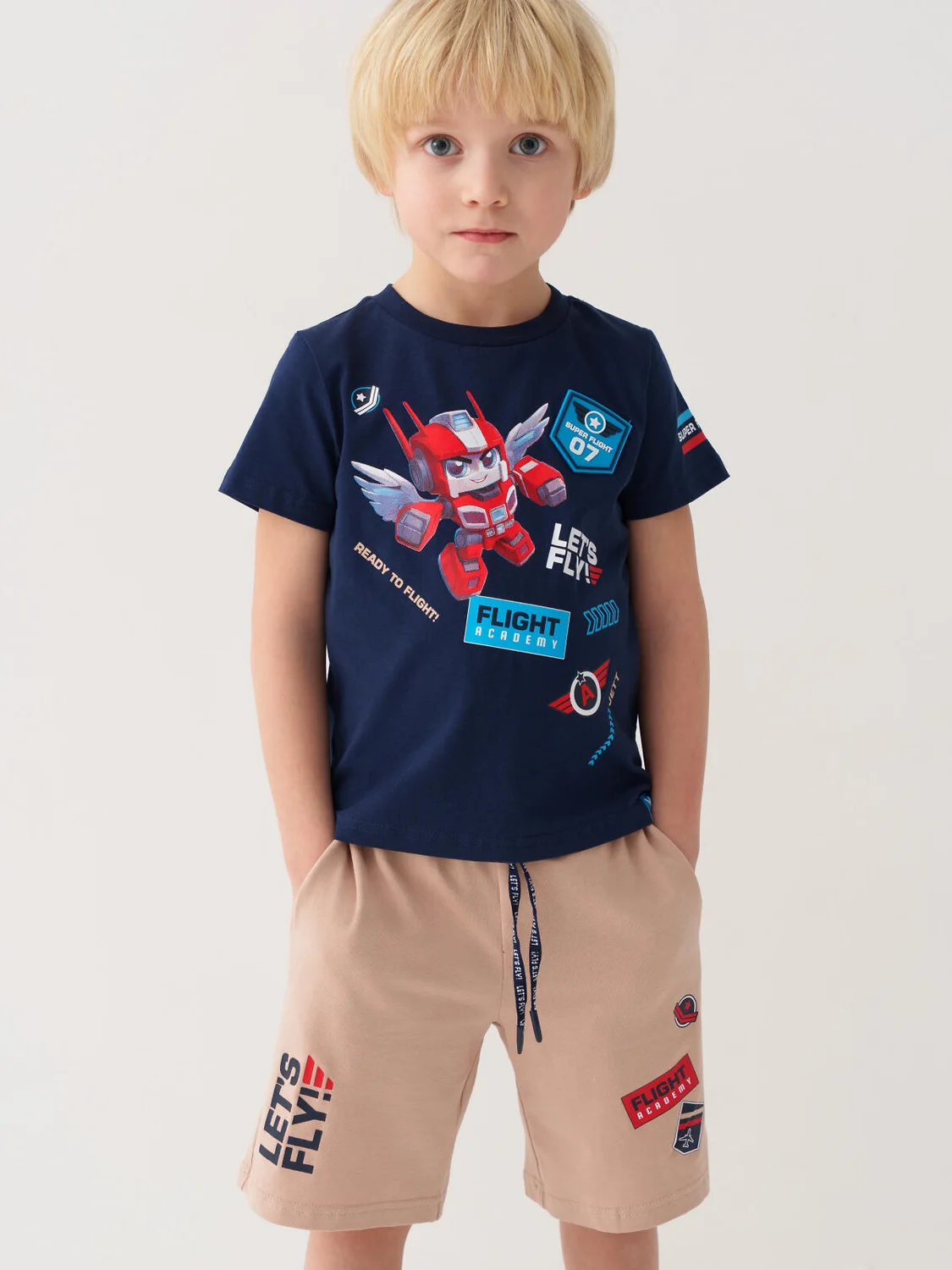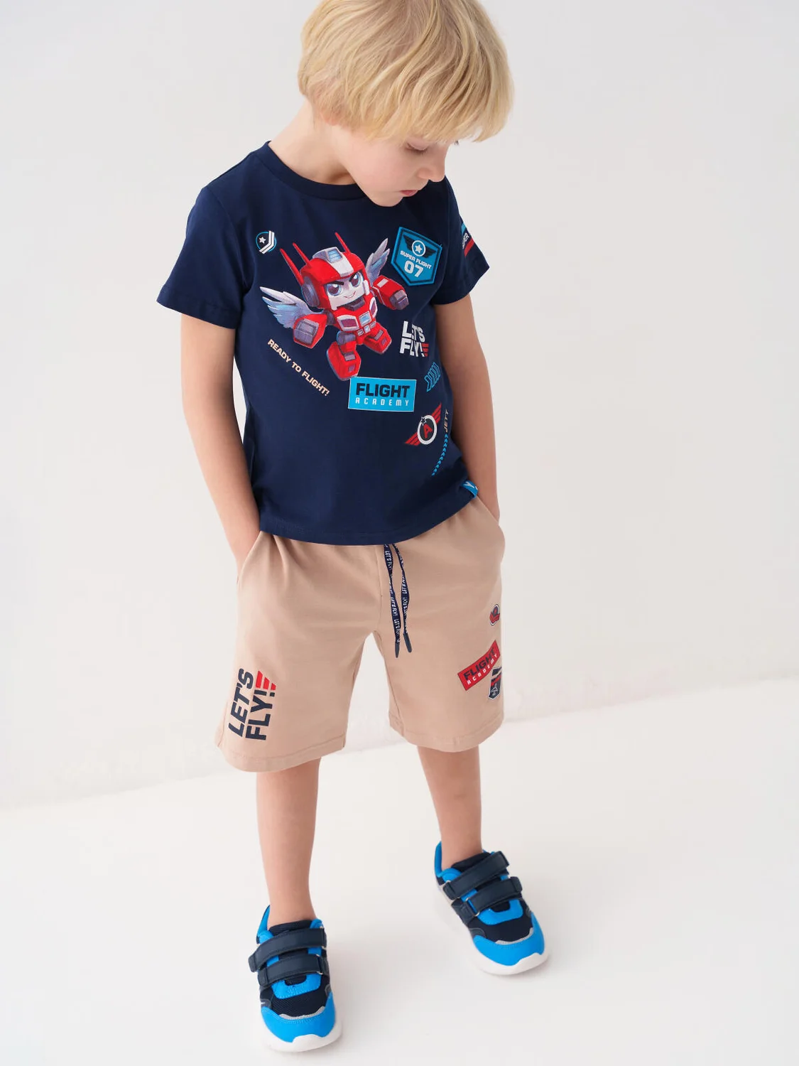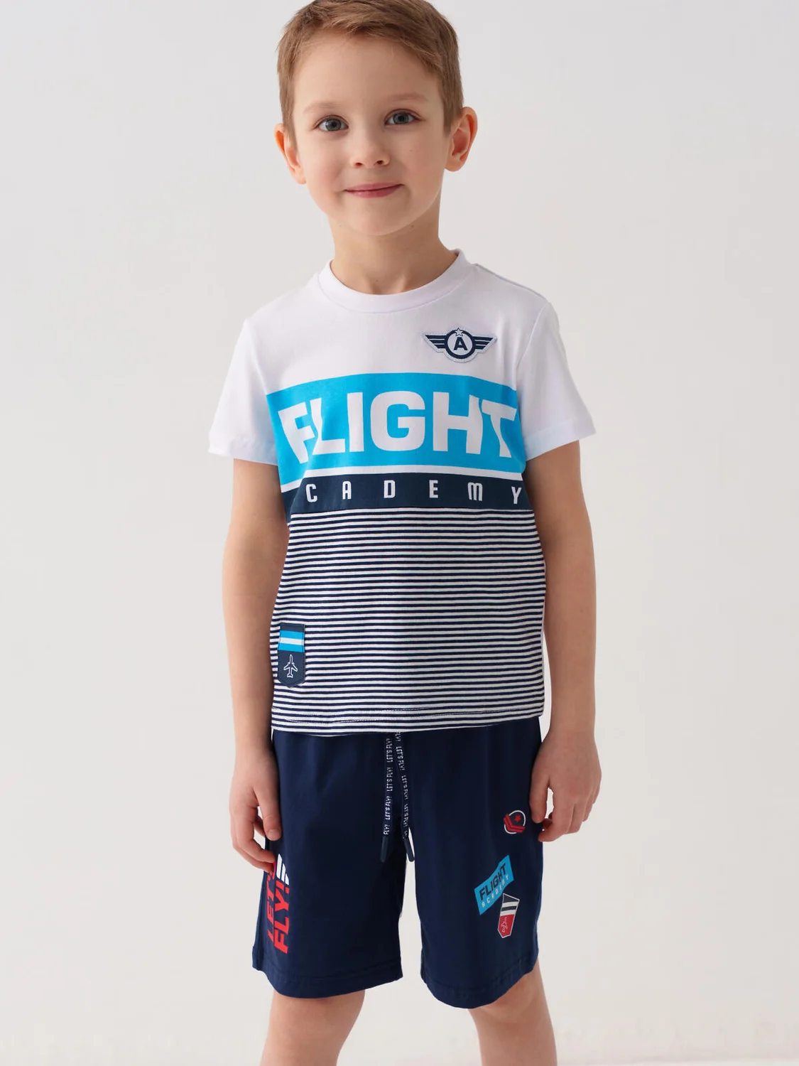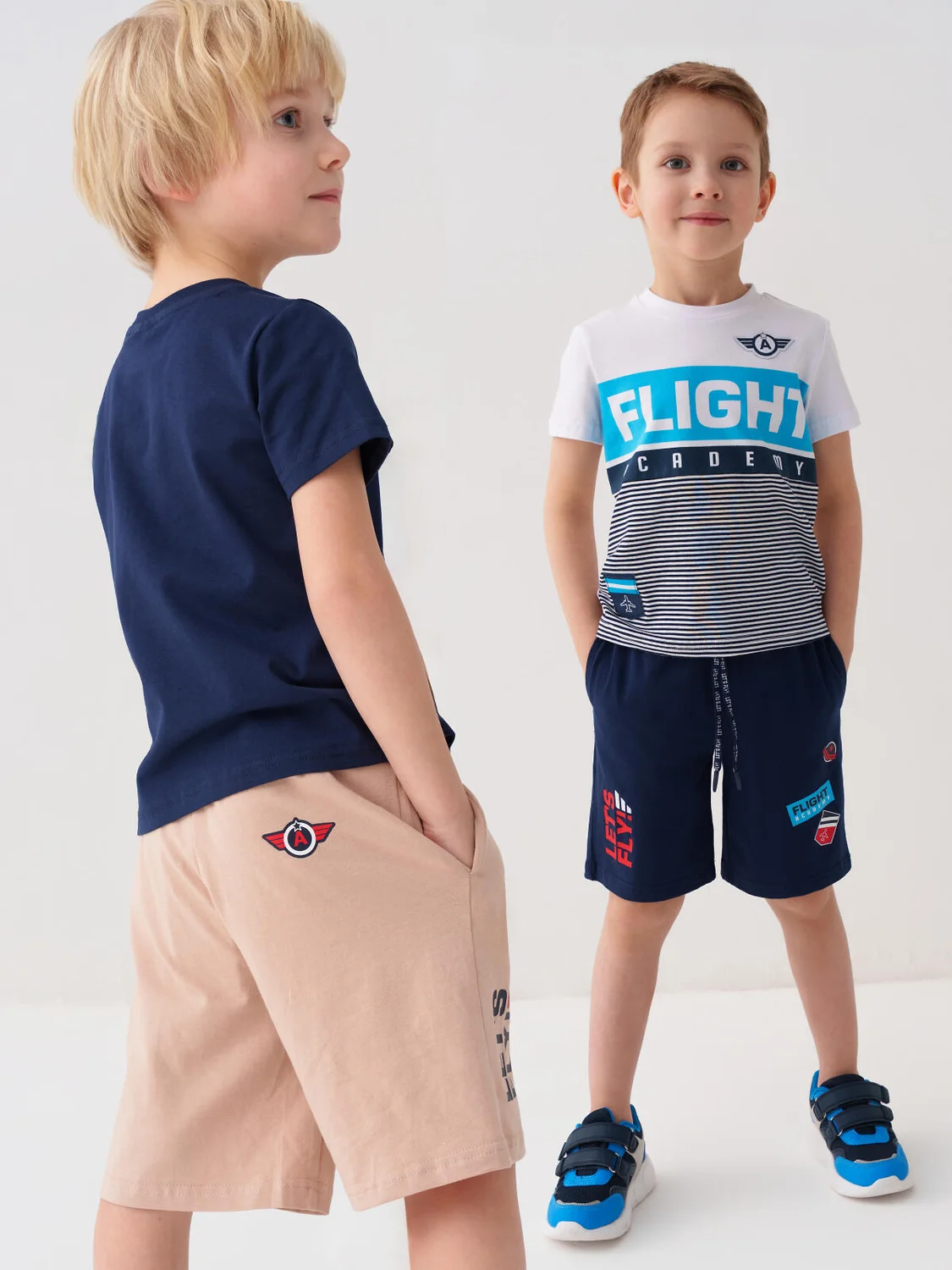 Набор детских шорт для мальчика. В комплект входят две пары шорт свободного кроя, ниже колена. Модели из мягкого, хлопкового трикотажа джерси. Удобная посадка обеспечивается эластичным поясом со шнуром. По бокам расположены два кармана.