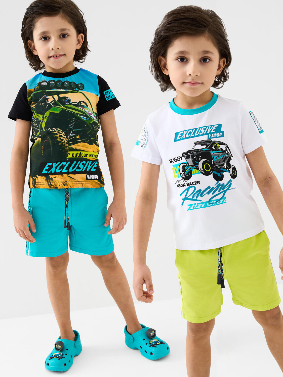 Набор детских шорт для мальчика. В комплект входят две пары шорт свободного кроя. Модели из мягкого, хлопкового трикотажа джерси. Удобная посадка обеспечивается эластичным поясом со шнуром. По бокам расположены два кармана.