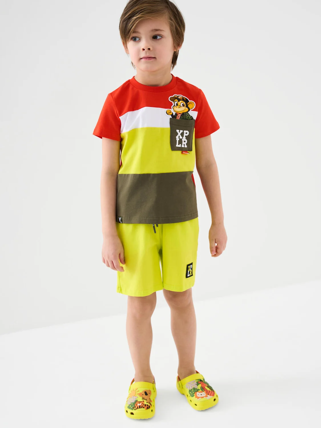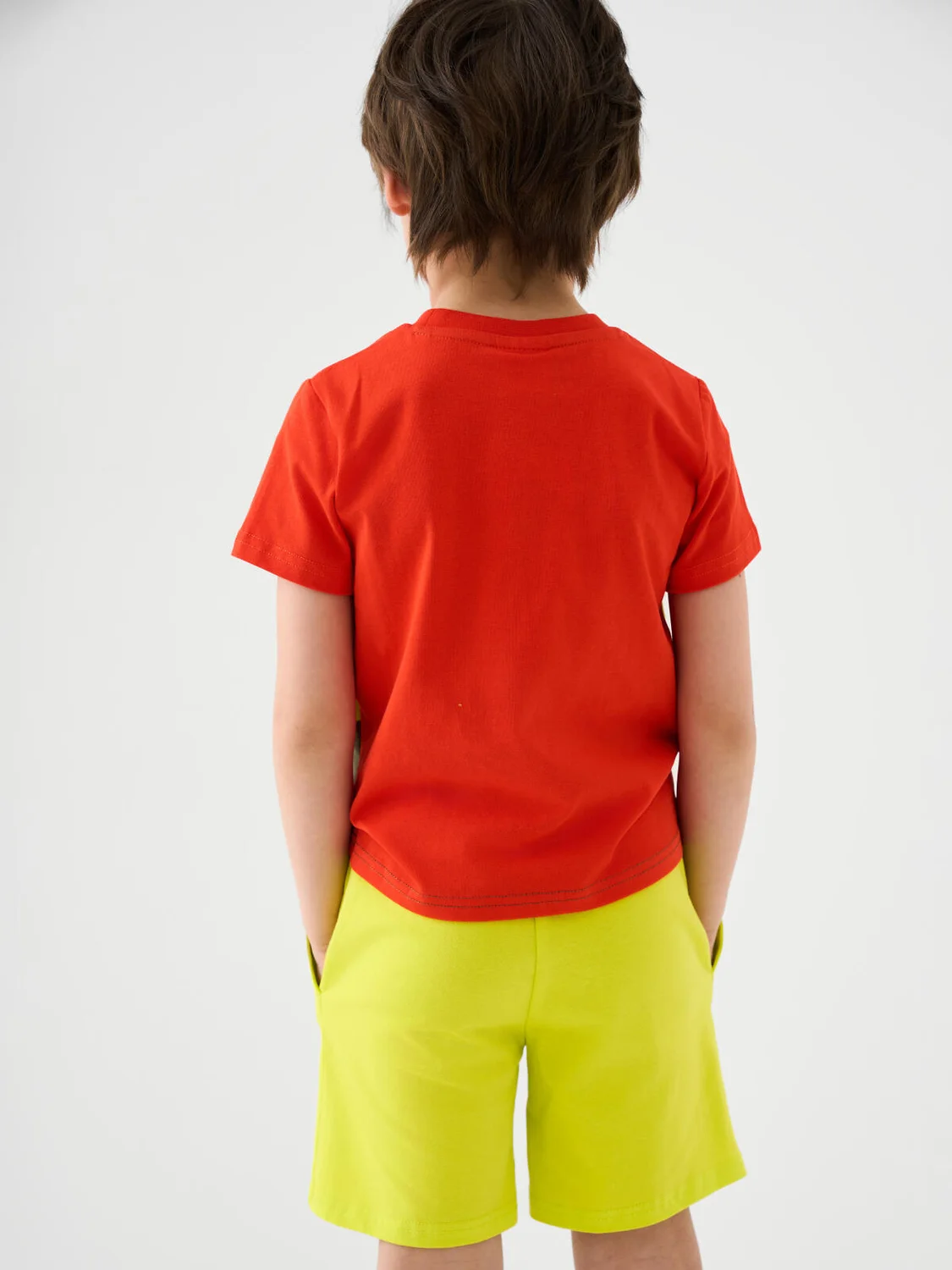Набор детских шорт для мальчика. В комплект входят две пары шорт свободного кроя, длиной выше колена. Модели из мягкого, хлопкового трикотажа джерси. Удобная посадка обеспечивается эластичным поясом со шнуром. По бокам расположены два кармана.