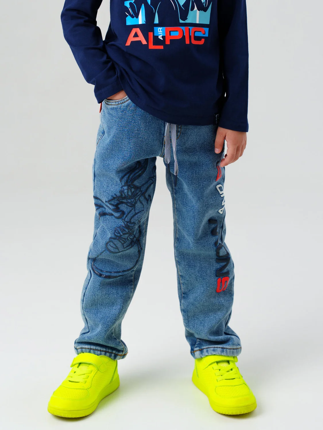 Модель оснащена четырьмя функциональными карманами, а два принта на передних штанинах добавляют стильный акцент в духе уличной моды и подчёркивают характер. Эти джинсы отлично подойдут как для школьных будней, так и для прогулок, отдыха или встреч с друзьями.