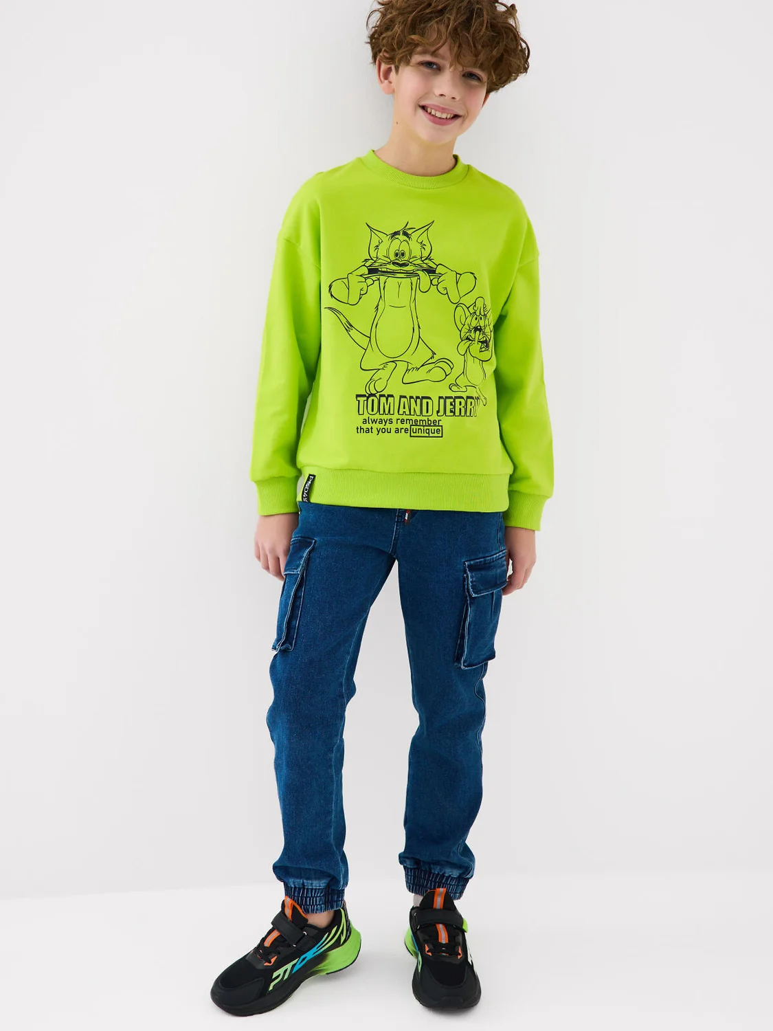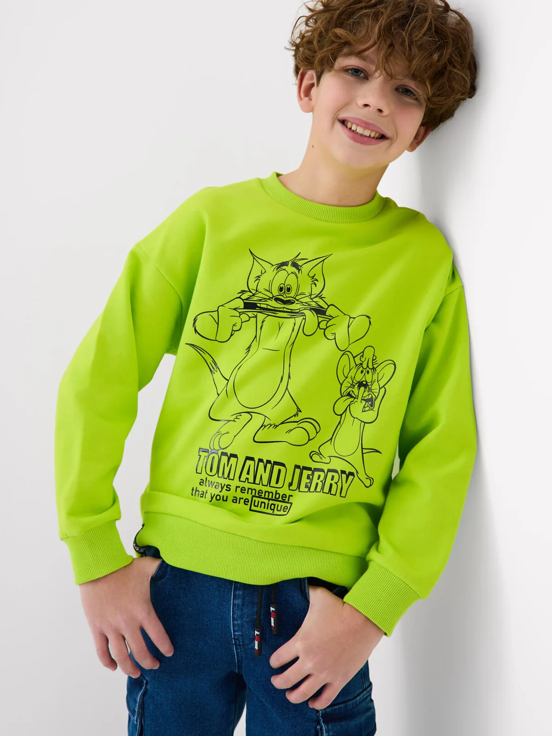 Оверсайз свитшот Том и Джерри для мальчика подростка. Модель с круглым вырезом, длинными рукавами и манжетами. Выполнена из футера без начеса. Пояс и манжеты выполнены из эластичного риба, что обеспечивает хорошую посадку. Яркий принт с любимыми героями мультфильма "Tom and Jerry".