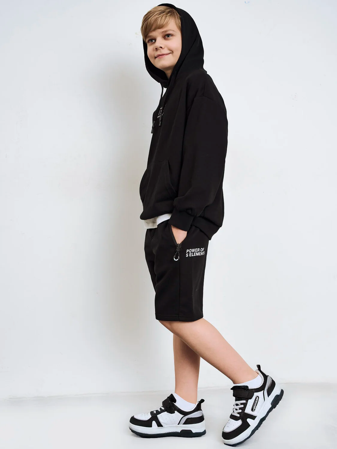 Чёрное худи оверсайз для мальчика подростка. Модель свободного кроя, с длинными рукавами и удобным карманом-кенгуру спереди. Капюшон оснащён шнурком для регулировки. По низу изделия и на рукавах — мягкие трикотажные манжеты. На груди — декоративная нашивка с надписью. Толстовка выполнена из приятного на ощупь хлопкового футера без начеса.