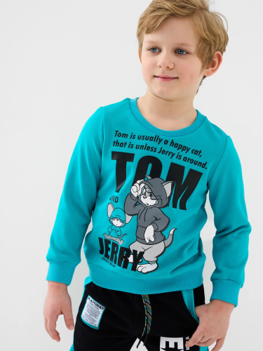 Детский свитшот для мальчика. Выполнен из хлопкового футера без начеса. Спереди — яркий принт с любимыми героями из мультфильма "Том и Джерри". Горловина, манжеты и низ изделия выполнены из эластичного риба, что обеспечивает комфортную посадку.