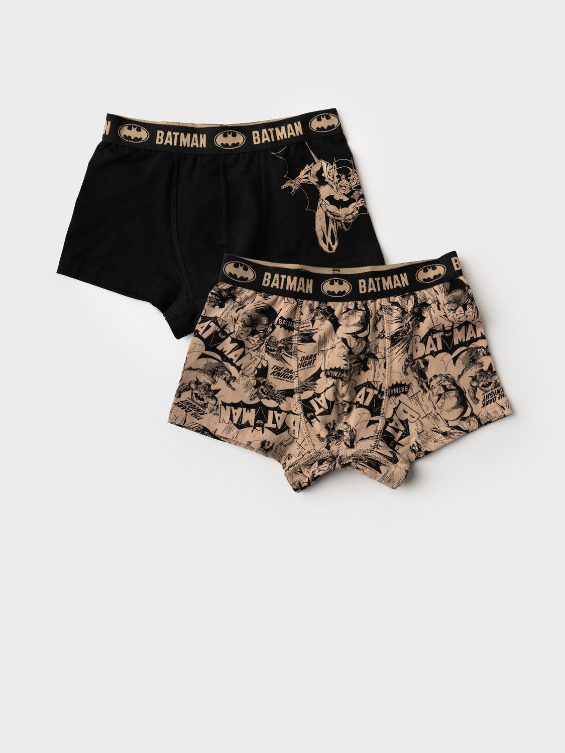 Набор из двух трусов-боксеров для мальчика подростка. Изделие плотно прилегает к телу, не имеет боковых швов, что делает его особенно комфортным. Эластичный пояс с логотипом бренда обеспечивает надёжную посадку. Принт с любимым персонажем - Бэтменом. Материал — мягкий хлопковый трикотаж, приятный к телу.