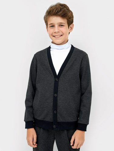 Жакет без начеса для мальчиков, в высококачественном составе. Центральная застежка на пуговицы, горловина V-образной формы, вместительные карманы, длинные рукава, пояс и манжеты из основного полотна – очень комфортная модель. Рекомендуем вашему мальчику!