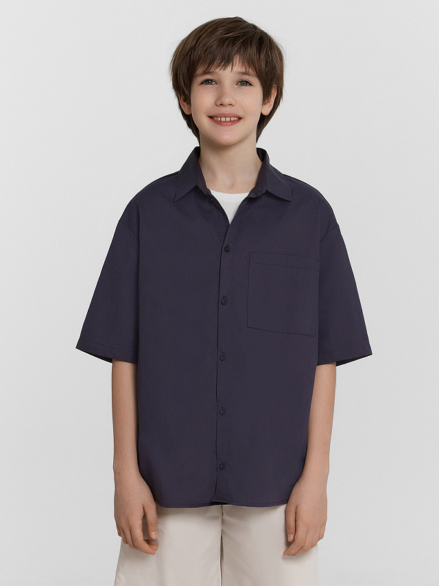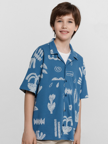 Рубашка для мальчиков прямого силуэта с воротником. По переду обработана застежка на пуговицу d=10mm и петли. На правой детали переда накладной карман. Рукава короткие, втачные, слегка спущены. Нижние срезы изделия и рукавов обработаны швом в подгибку.
