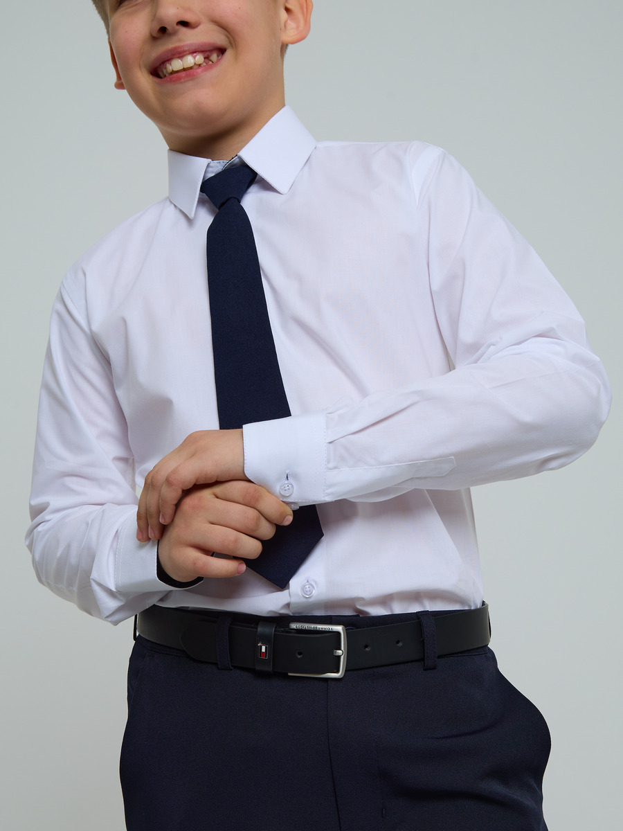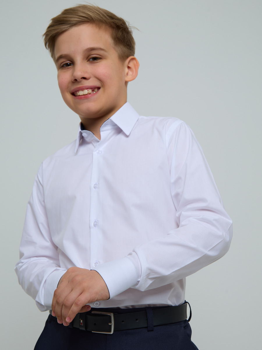 Рубашка изготовлена из хлопка, устойчива к заломам, свободный силуэт на кокетке по спинке, все швы закрытого типа. Детали: свободная посадка, отложной воротник, застёжка на пуговицах, вытачки на спинке, декор: кант т-синий. Манжеты со скошенными краями, имет две пуговицы и шлица по низу рукова.