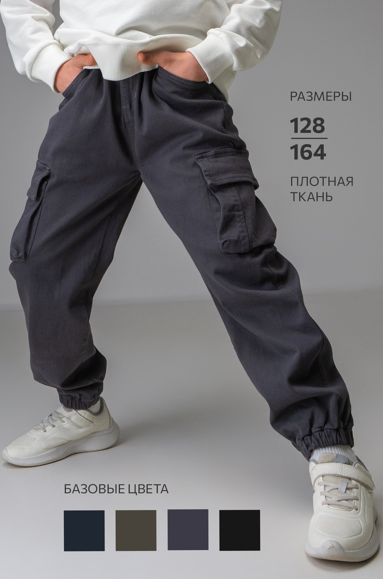 *замеры выборочные, могут незначительно отличаться. ки джоггеры для мальчиков и подростков выполнены из ткани габардин. Практичные брюки с большими накладными карманами идеальны на каждый день. Подростковые брюки карго свободного кроя, эластичный пояс регулируется шнурком, низ штанин собран на резинку.