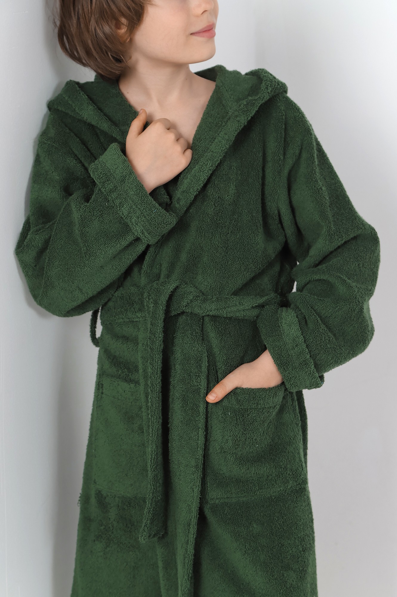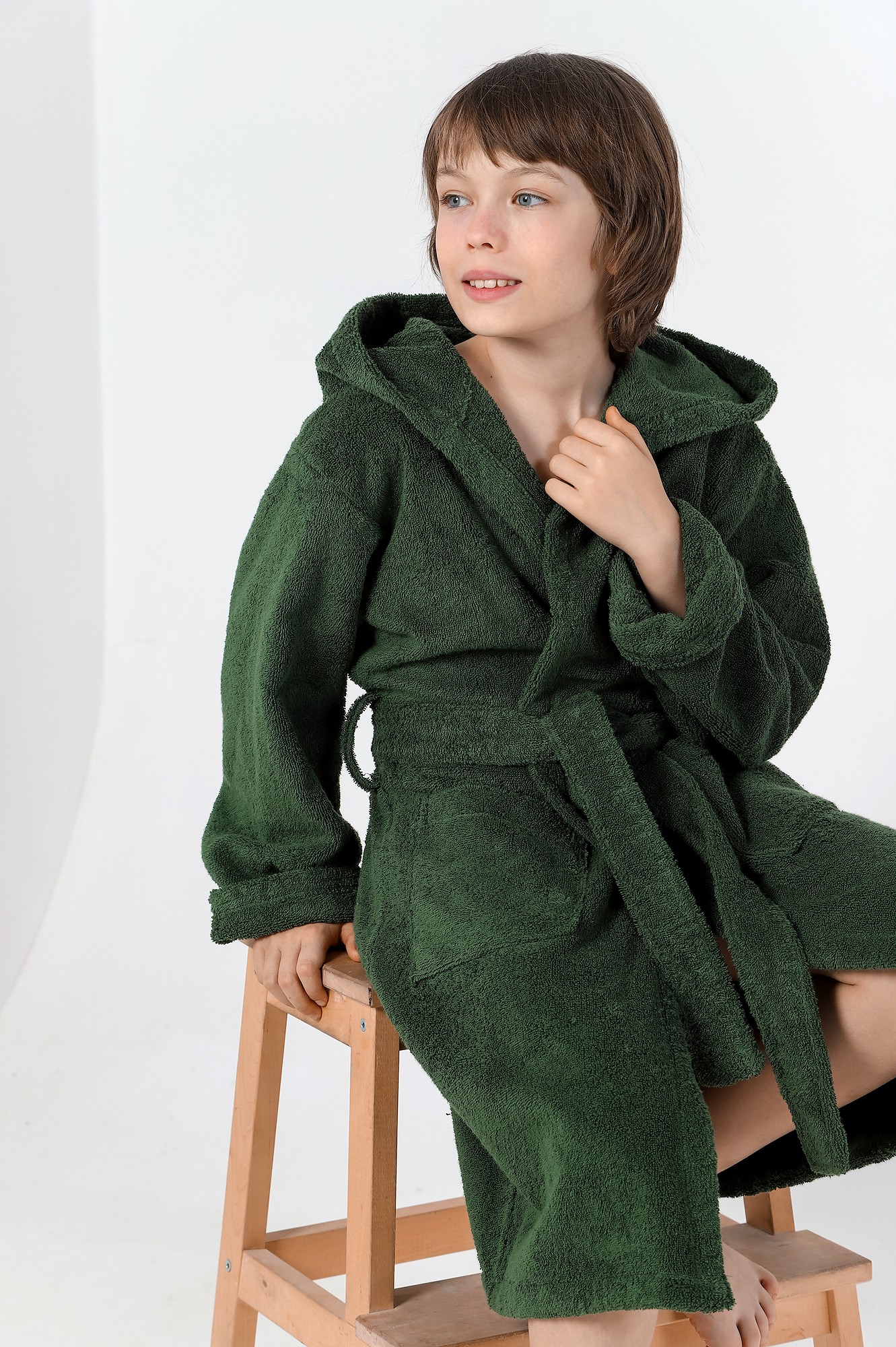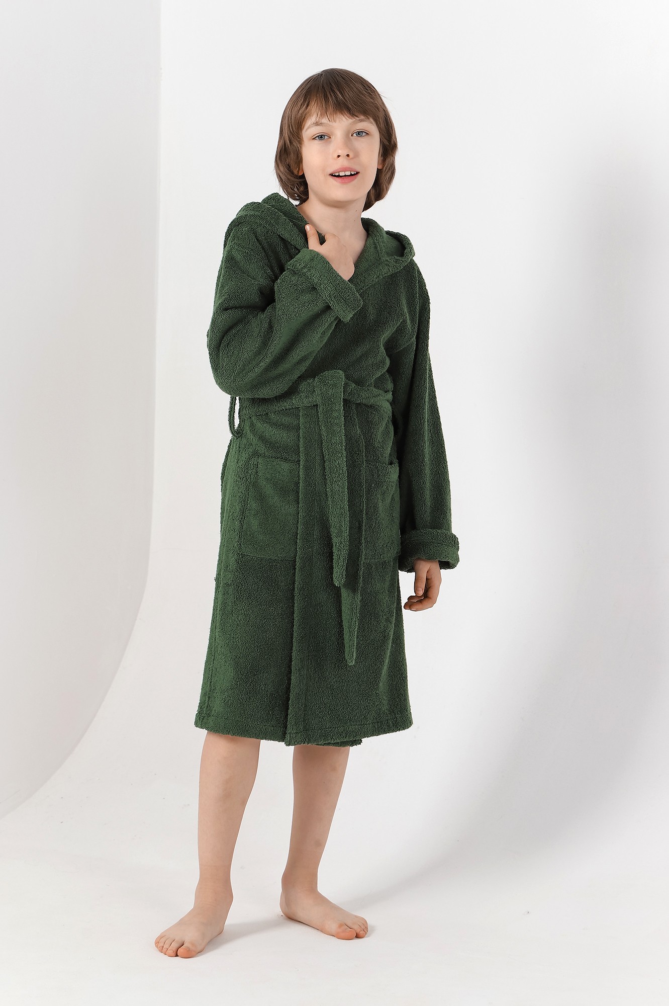 Халат для мальчика из двустороннего махрового хлопкового полотна. Модель на запах, с капюшоном, с поясом в шлёвках с петлей-вешалкой по горловине спинки, с боковыми карманами.
