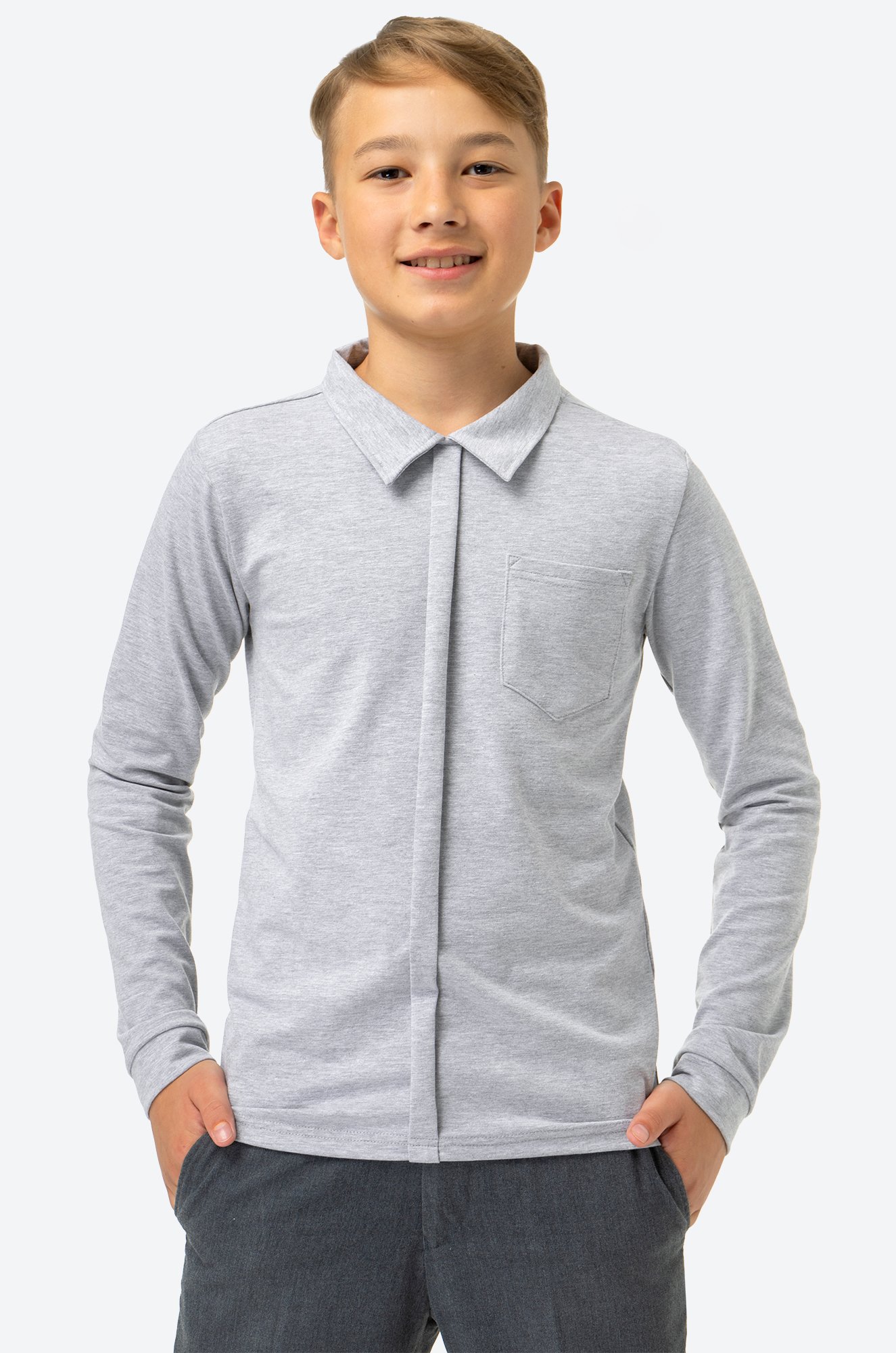 Ключ к стильному школьному образу найден! Детская рубашка для мальчиков и мальчиков-подростков из приятного к телу хлопка станет отличным дополнением к школьной форме. Строгий отложной воротник, длинный рукав с манжетами, акцентный нагрудный карман – эта серая рубашка для детей точно поможет выделиться среди сверстников!