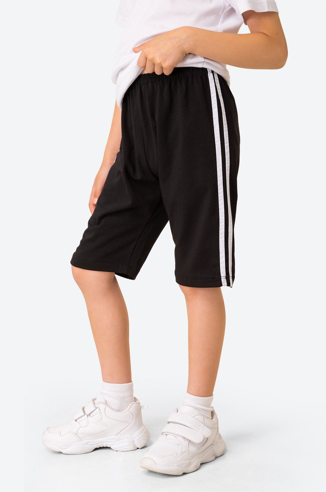 Детские спортивные шорты с лампасами порадуют каждого мальчишку! Шорты для мальчика с сшиты из натурального хлопка с добавлением эластана, что способствует увеличению прочности ткани и лучшей посадке по фигуре. Черные шорты прямого кроя не сковывают движений.